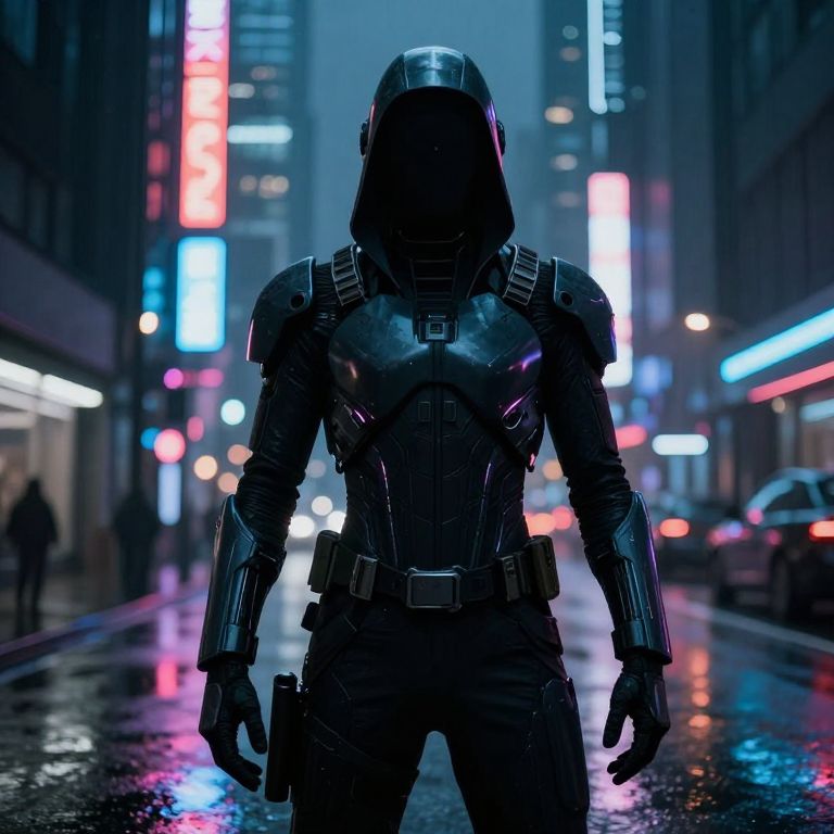 Cyborg soldier in dark, reflective armor stands in a neon-lit, rainy urban street, face obscured, futuristic cityscape in the background.