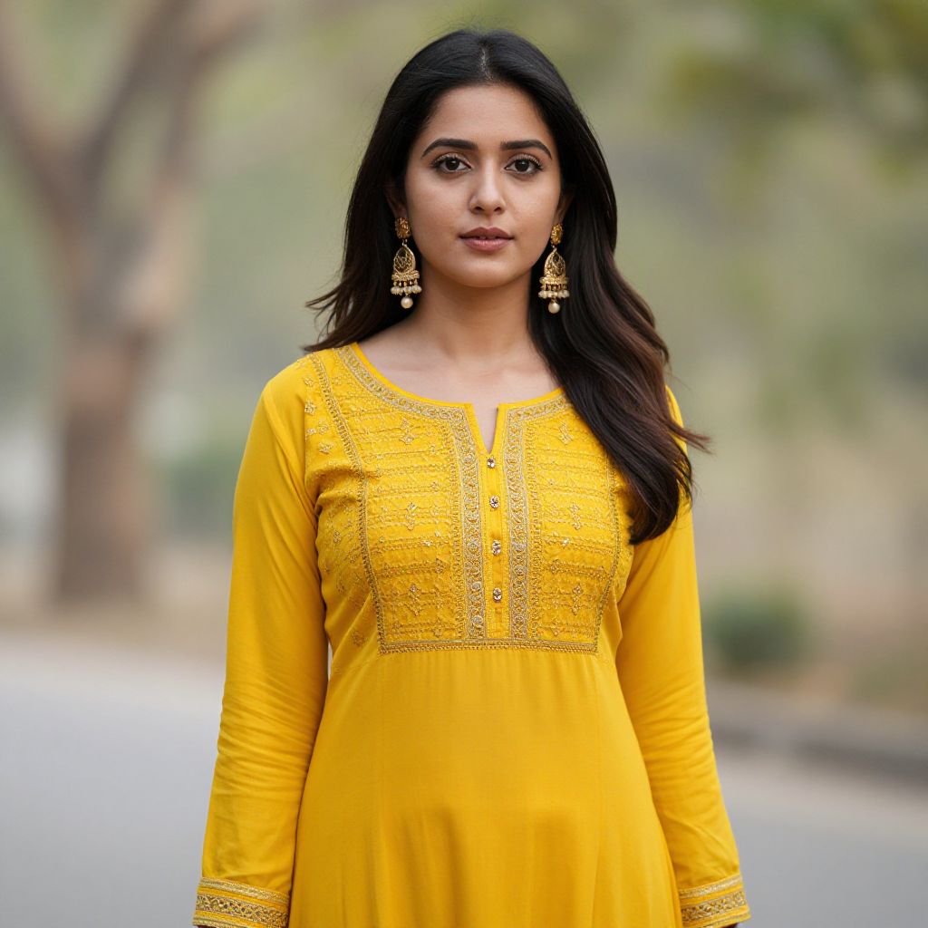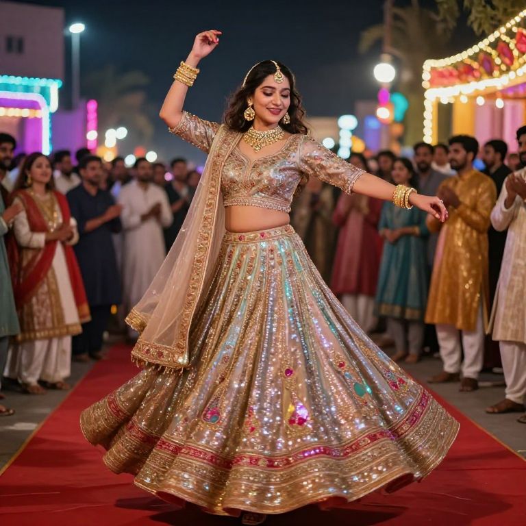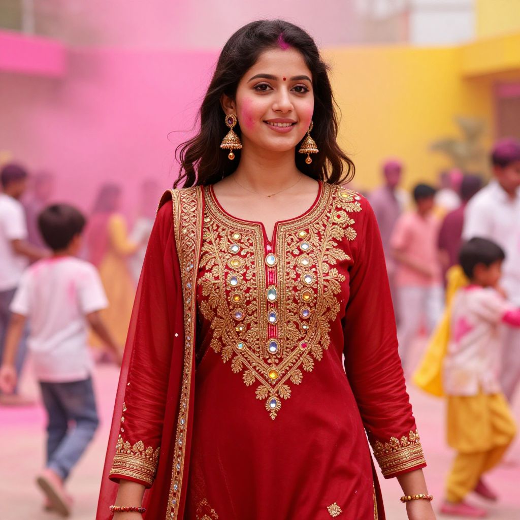 A colorful salwar kameez with geometric patterns, styled by a woman in a heritage festival scene, joyful atmosphere, colorful backdrop of banners and music, diverse audience in the background, festive energy, high detail, vibrant composition, Flux style.