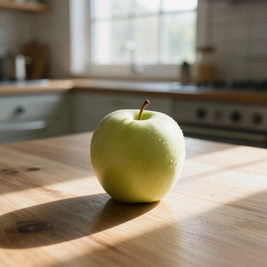 Natural light apple on a wooden table, soft shadows, crisp focus, morning sunlight streaming through a window, warm tones, rustic kitchen background, photorealistic style
