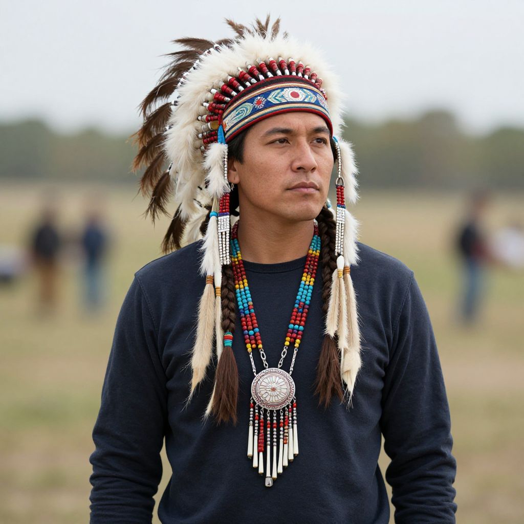"native american national, solo, 1boy, male focus, native american, necklace, jewelry, headband, outdoors, braid, standing, blurry, headdress, long sleeves, blurry background, day, cowboy shot, arms at sides, beads Realistic photo of casual sexy person with pretty face"
