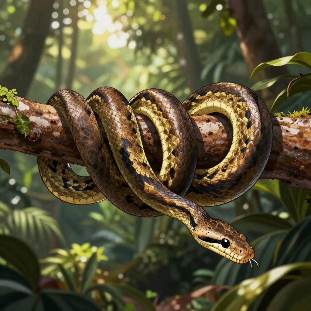 Close-up digital drawing of a detailed, colorful snake with black, orange, and brown scales, coiled on a tree branch, with a person's