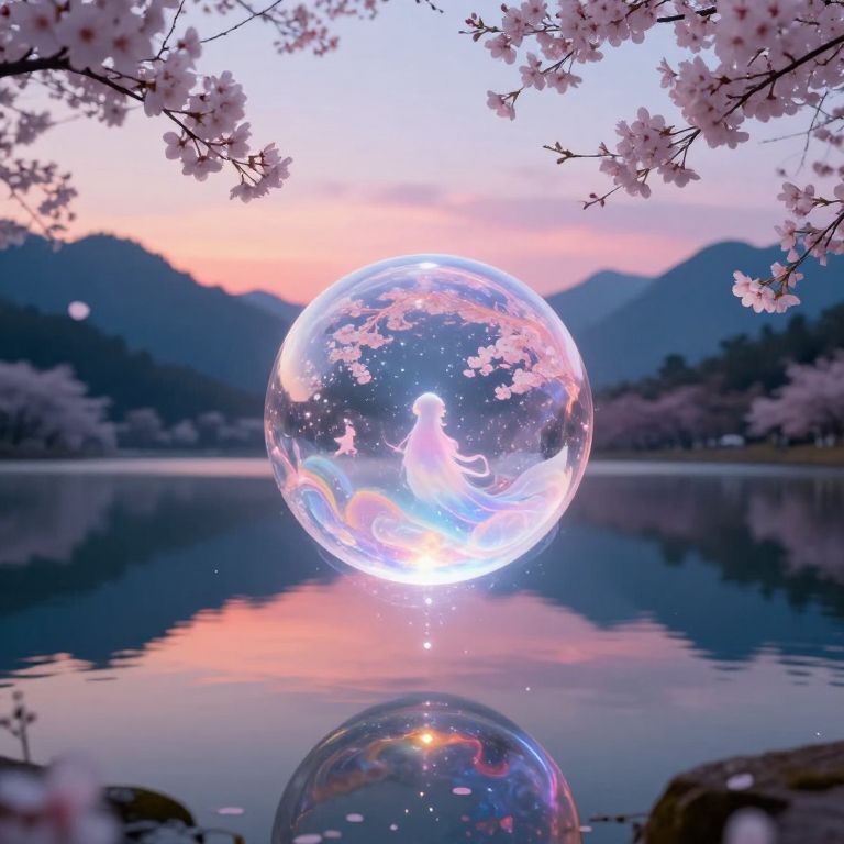 Envegel visualized as a glowing orb floating above a serene mountain lake at twilight, reflecting the colorful sky and surrounded by delicate cherry blossoms and mystical creatures, fantasy art style, soft lighting