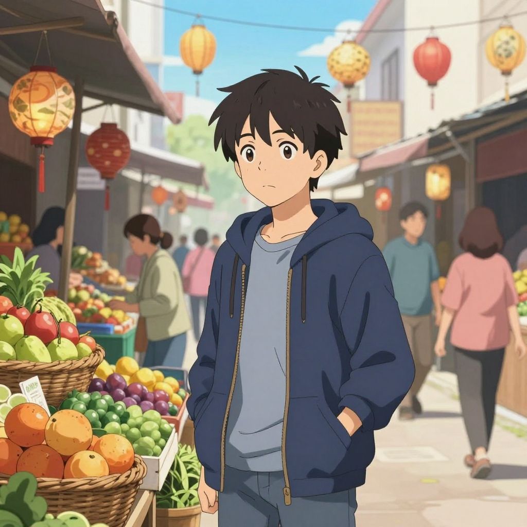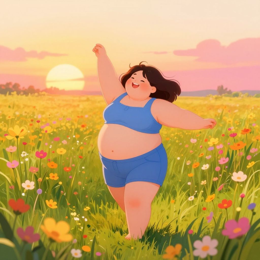 A digital illustration of a chubby, light-skinned man with short black hair, wearing a white tank top and dark blue shorts, sitting on a checkered picnic blanket in a sunlit, lush forest. He gazes upward, surrounded by vibrant flowers and trees. In front of him, there are plates of assorted fruits, donuts, and a glass of orange juice. A wicker basket with more fruit rests on the right side. The scene exudes a warm, peaceful summer vibe. The detailed, colorful art style adds a whimsical, inviting feel to the image.