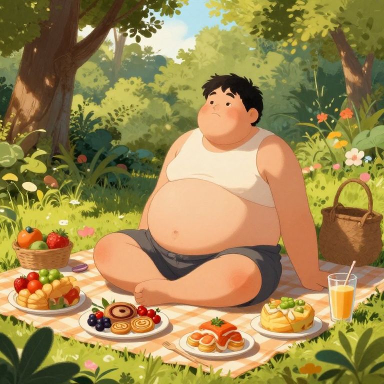 Digital illustration of a chubby man in a white tank top and black shorts, sitting on a picnic blanket in a sunny, lush forest, surrounded by baskets