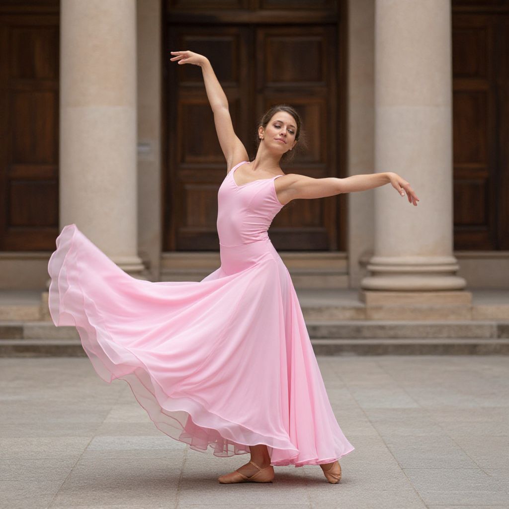 Photograph of a graceful woman in a flowing pink dress, mid-dance pose, arms extended, in front of a classical building with columns.