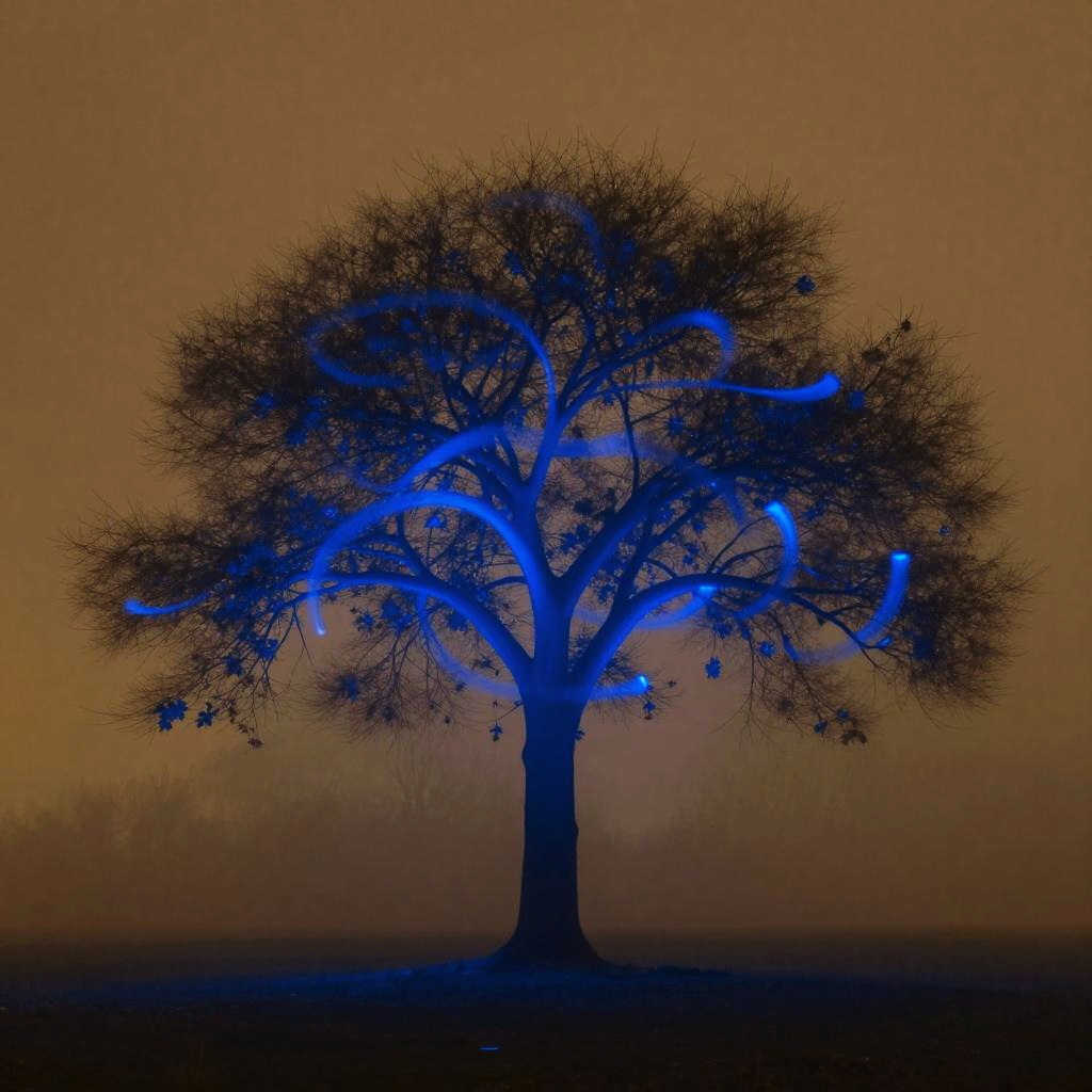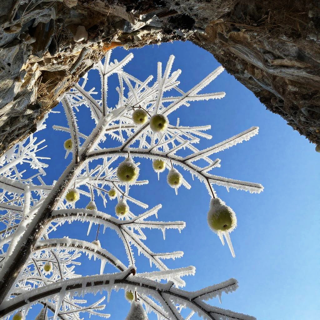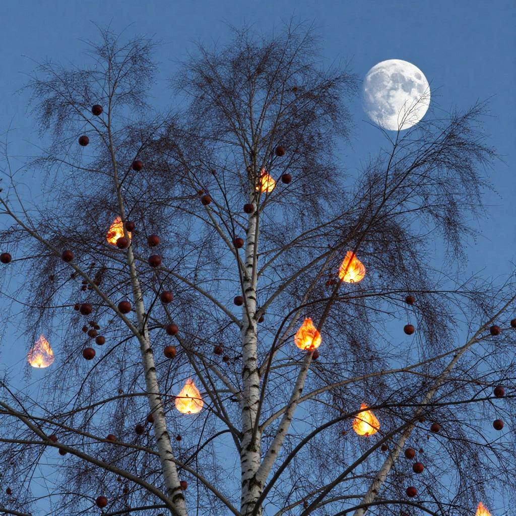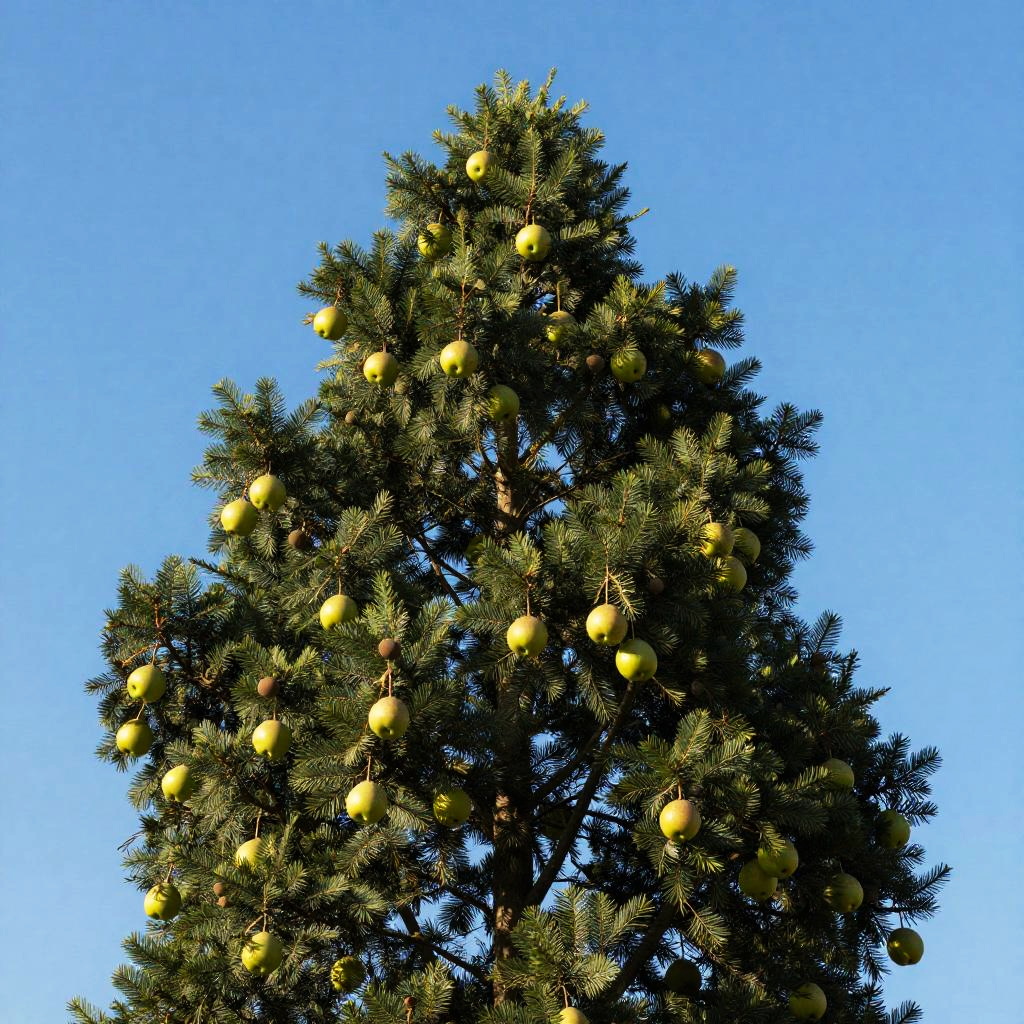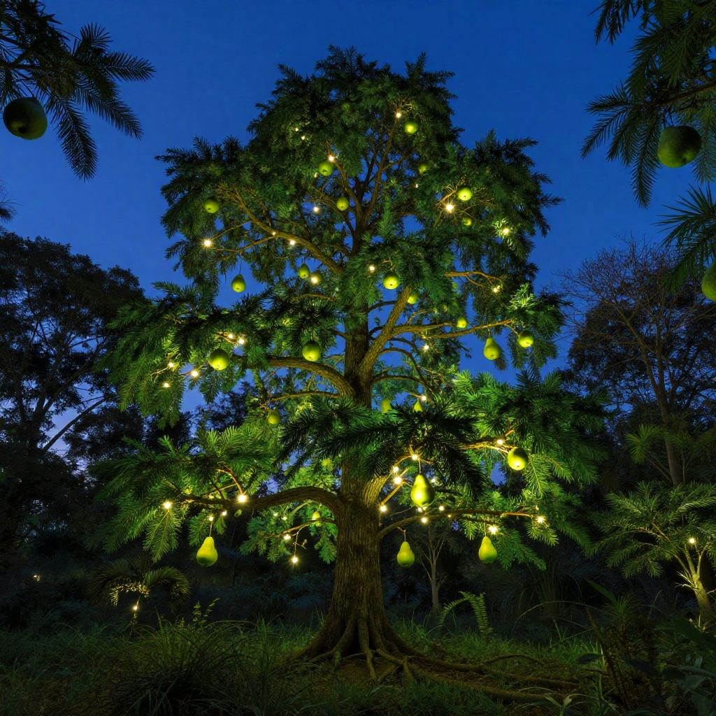On the windswept plateau is a towering sequoia, its branches reaching heavenward as if holding up the perfect blue sky. The tree's unique fruit hangs from the branches - not juicy apples or luscious pears, but rather glowing lanterns.