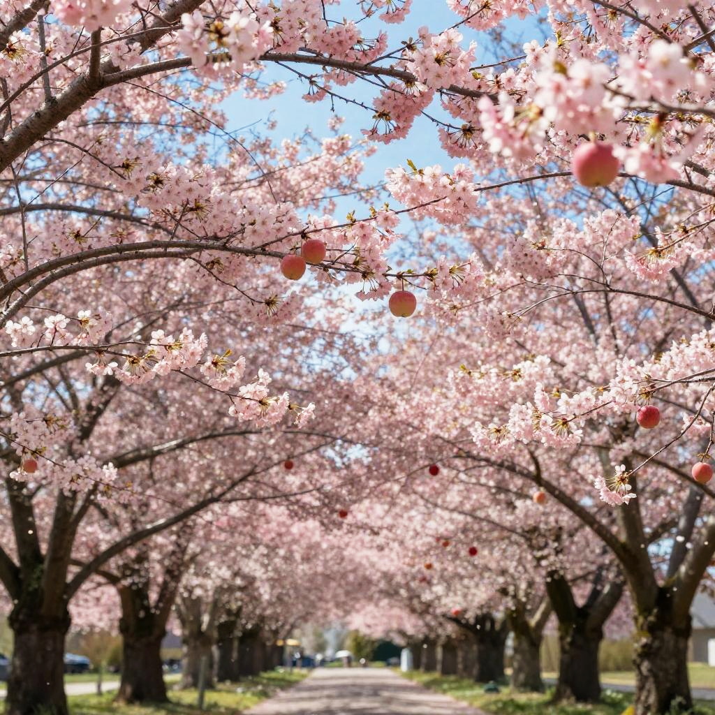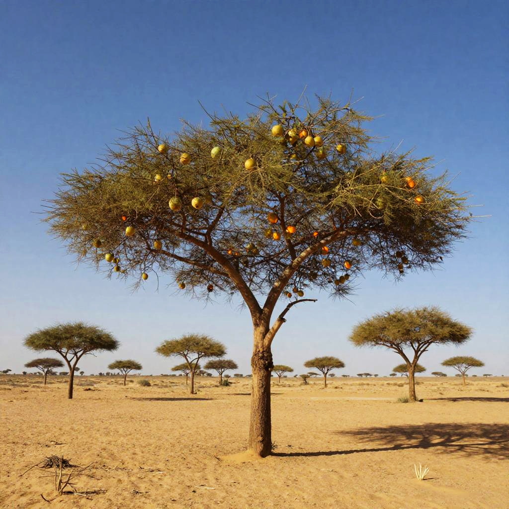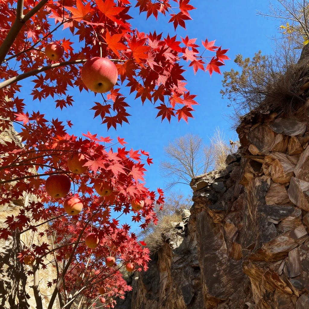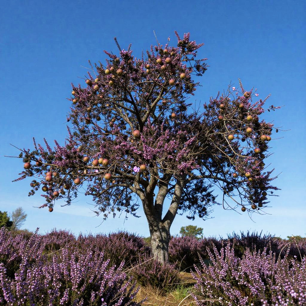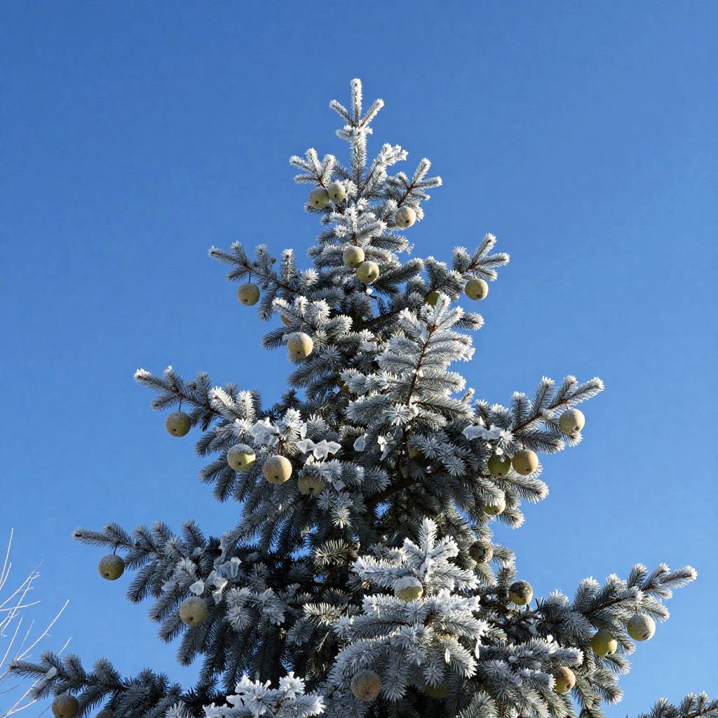 On the windswept plateau is a towering sequoia, its branches reaching heavenward as if holding up the perfect blue sky. The tree's unique fruit hangs from the branches - not juicy apples or luscious pears, but rather glowing lanterns.