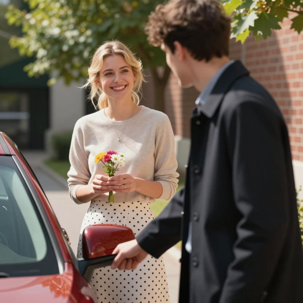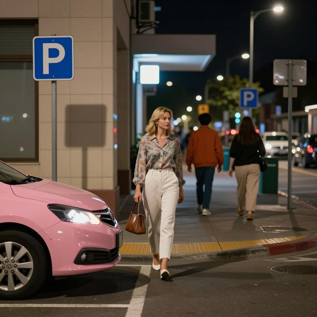 Nighttime urban scene, woman with blonde hair, patterned long-sleeve shirt, white pants, white shoes, walking on sidewalk, holding handbag. Pink car in foreground, blue parking sign on left, tiled building, neon lights, two people in background, one in orange jacket, one in beige pants. Streetlights, shadows, dark atmosphere.