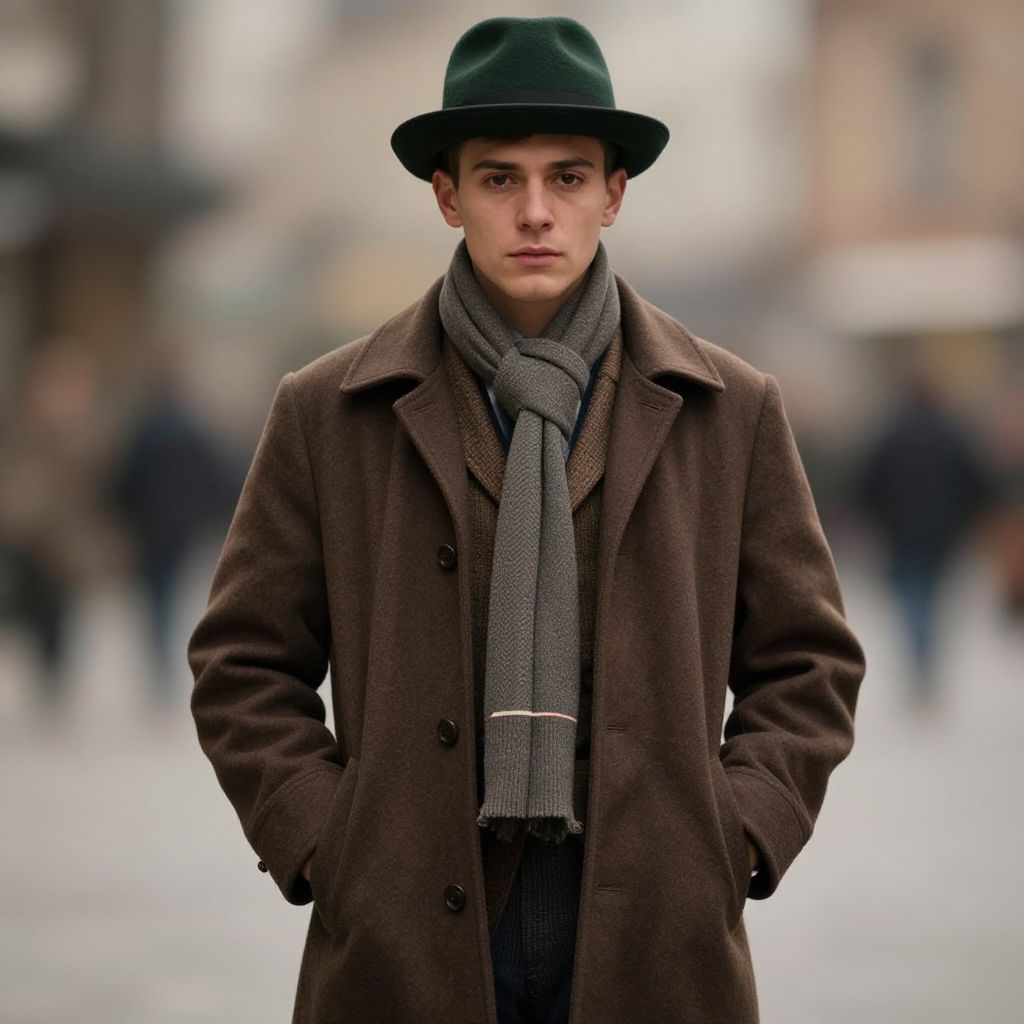 Boy canadian mountie costume, hat, belt, 1boy, blurry background, blurry, male focus, looking at viewer, arms behind back, outdoors, smile, solo focus, brown belt, coat, scarf, belt buckle