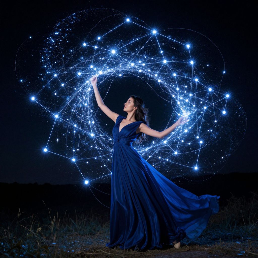 Ethereal woman in a deep blue gown gracefully extends her arms, weaving a luminous web of starlight that radiates cosmic energy, transforming the night sky into a dynamic constellation of shifting patterns.