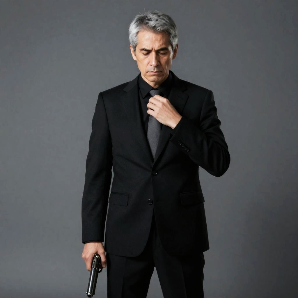 Middle-aged man in black suit, white shirt, and loosened tie, sitting against a weathered white wall, legs bent, holding a gun in his right hand. Green plants at his feet. He looks up with an intense expression. Background includes large, rectangular, white, wooden panels. Overcast lighting.