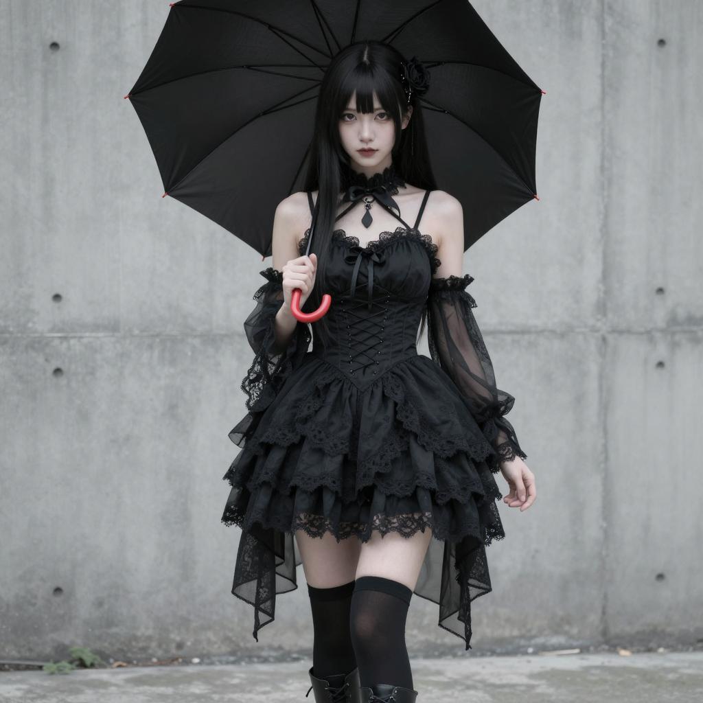 Portrait of an Asian woman standing in a stone hallway with tall columns. She wears a black cap and has straight black hair with bangs. Her outfit consists of a brown double-breasted dress with silver buttons, a black cape with red embroidery on the left side, and black knee-high socks. She holds a black umbrella in her left hand while extending her right arm outward, showcasing a grim expression. The lighting comes from the left side, highlighting the architectural details and her gothic attire.