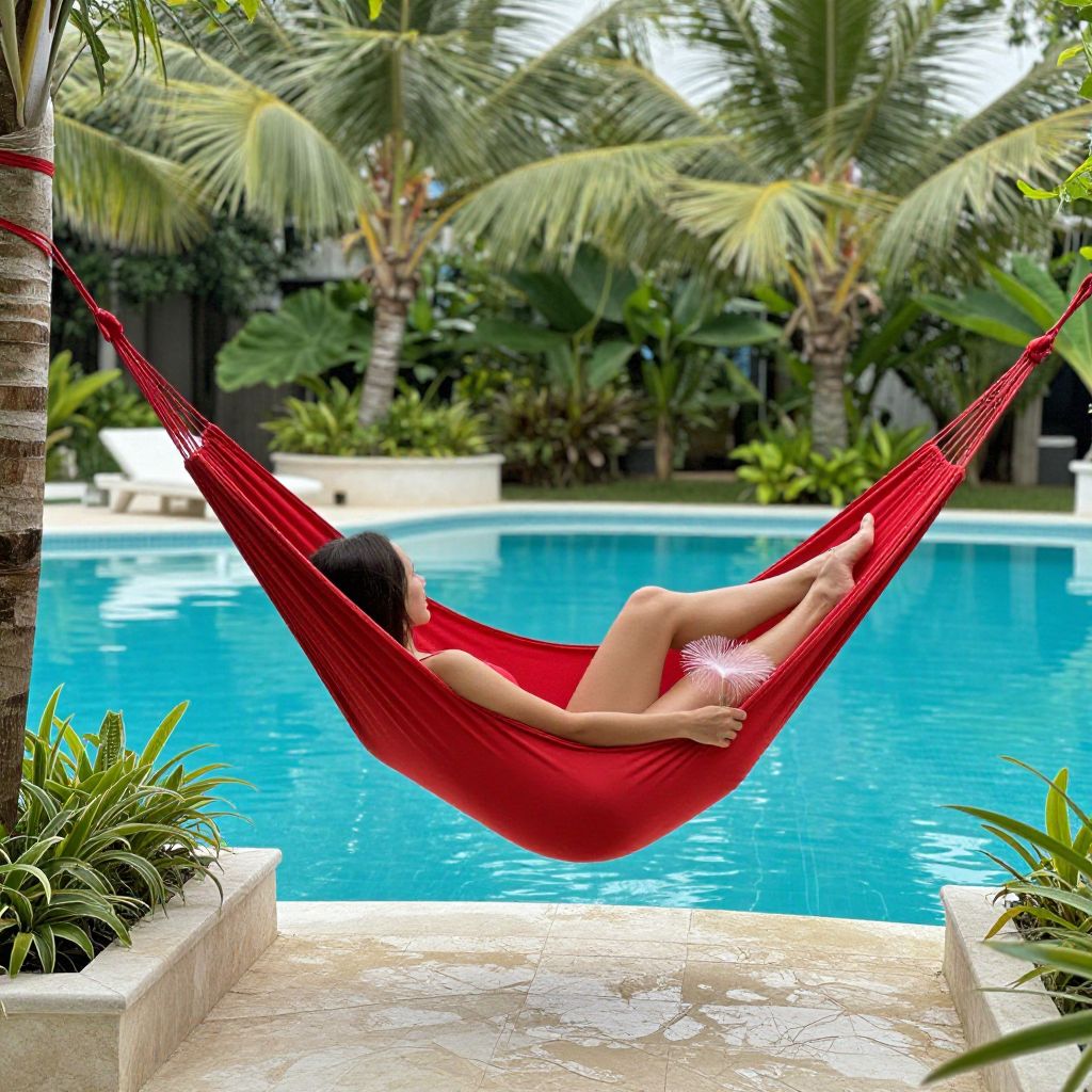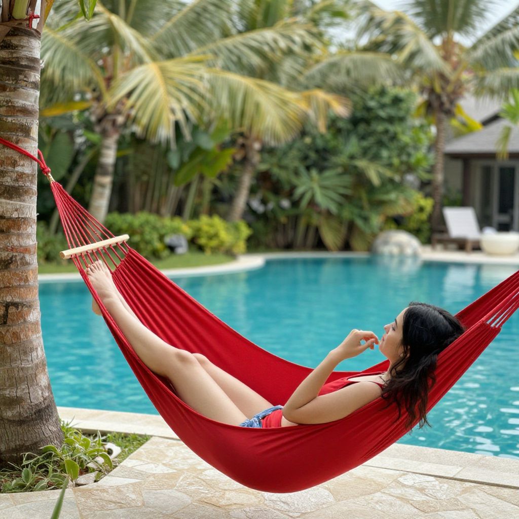 Woman lounging in a vibrant red hammock by a serene turquoise pool, surrounded by lush greenery and palm trees, exuding relaxation and tranquility.