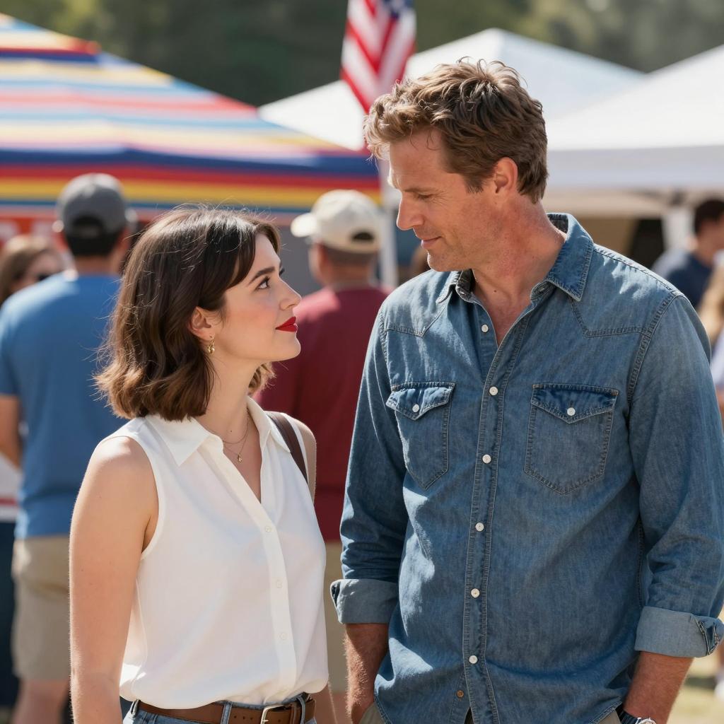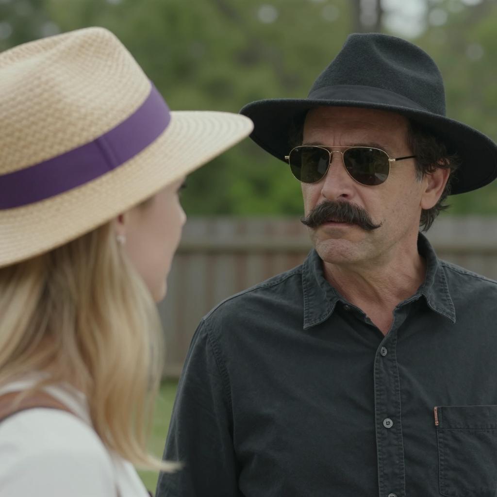 Middle-aged man with slicked-back hair, mustache, light blue shirt, and tattoo on right forearm, holding a brown paper bag, talking to a blonde woman with shoulder-length hair, wearing a gray tank top. Background: parking lot with red and blue cars, trees, and commercial buildings. Woman's back facing camera, man's left hand raised.