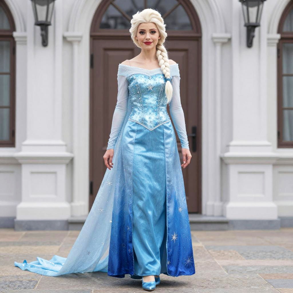 Frozen Woman Costume, a woman in a blue dress and red boots standing in a room