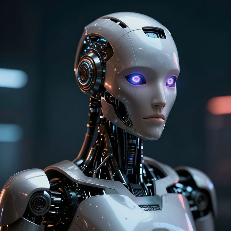Photorealistic CGI of a silver robotic humanoid with glowing blue eyes, metallic joints, and sleek, glossy surfaces in a dark, futuristic background.