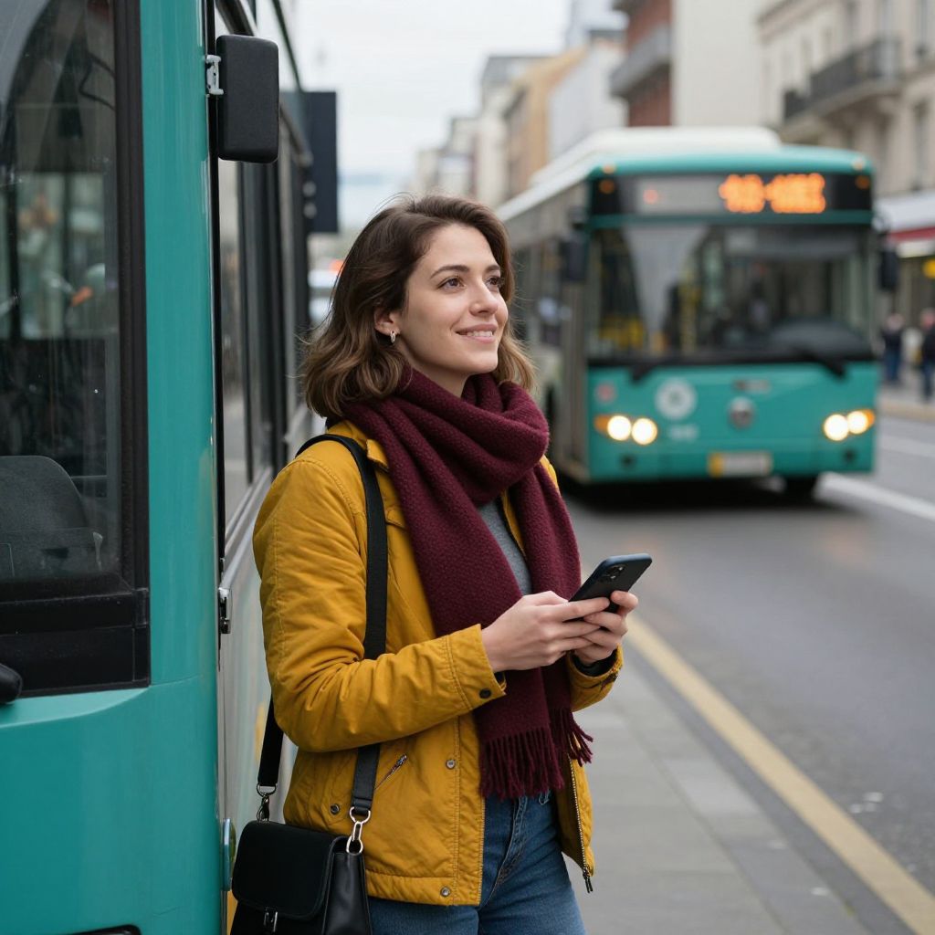 Smiling woman wearing a mustard jacket and maroon scarf stands by a teal bus, holding a smartphone while another bus approaches in the background along a bustling city street.