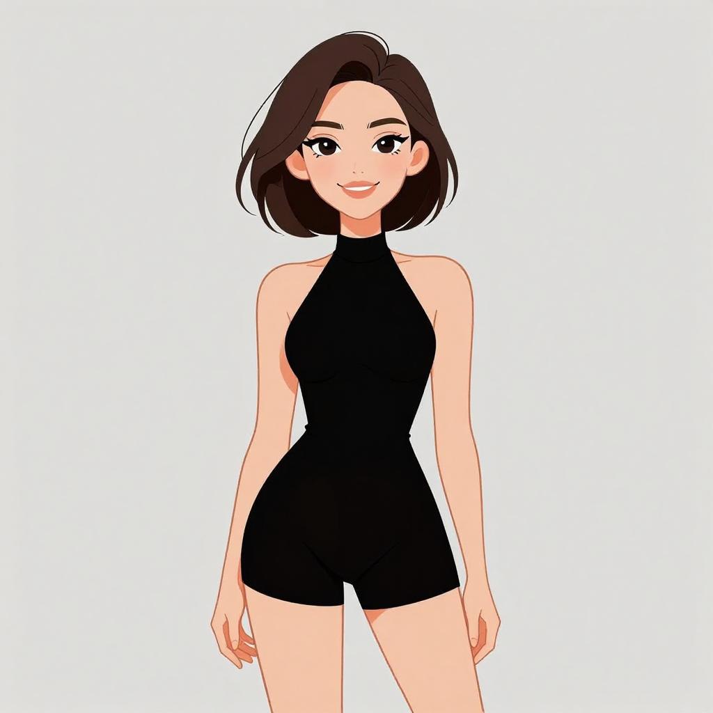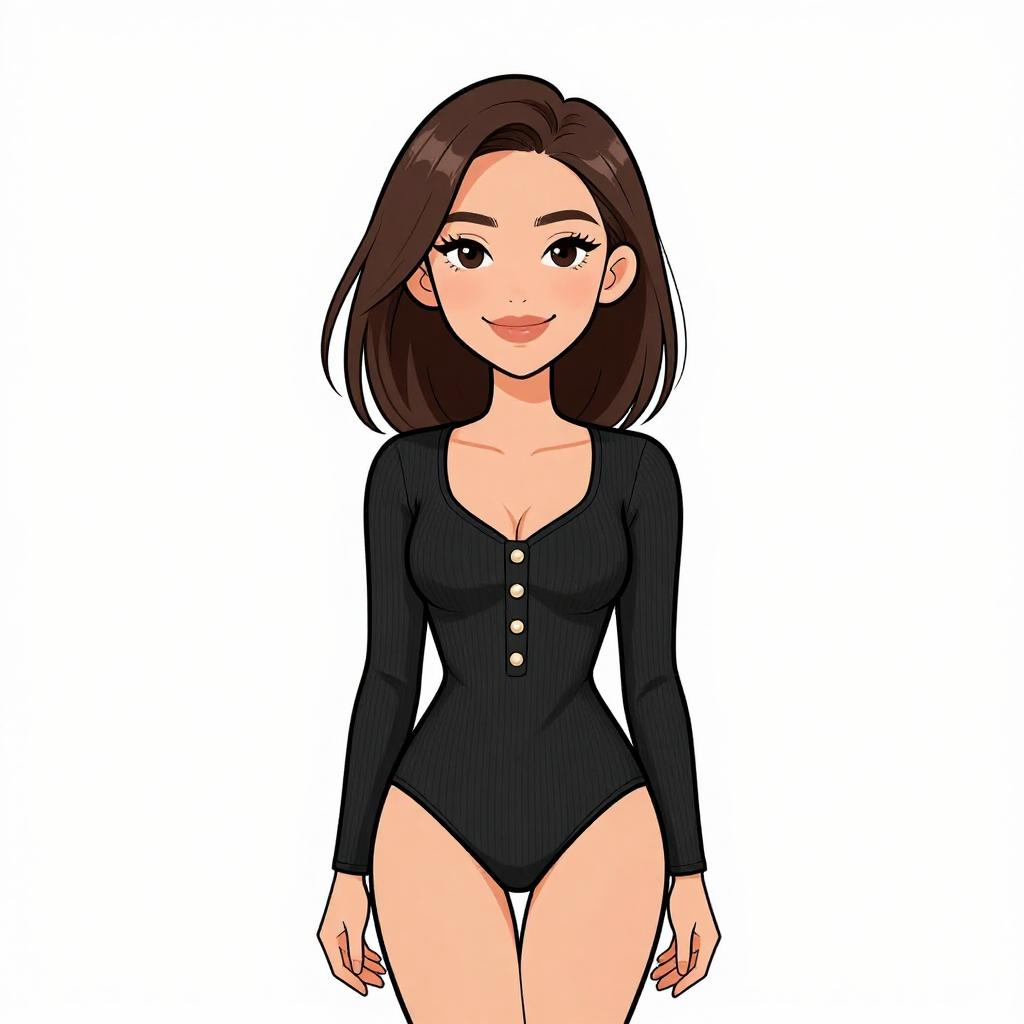 Woman with pretty face and pretty hair. smiling Woman, minimalist, black ribbed bodysuit, scoop neckline, long sleeves, decorative buttons down the front, high-cut leg, plain white background. --sref 1467