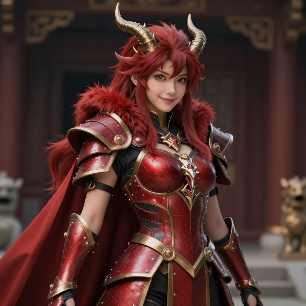 1girl, (red armor), (dragon horns), fur, cape, smile, extremely detailed, semi-realistic, (masterpiece