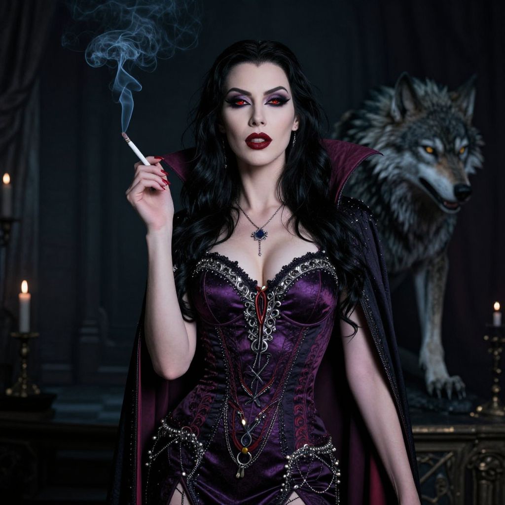 A mysterious vampire woman with red eyes and a smoking cigarette, wearing a revealing dress with intricate designs, stands in a dark, gothic setting with a wolf-like creature in the background.