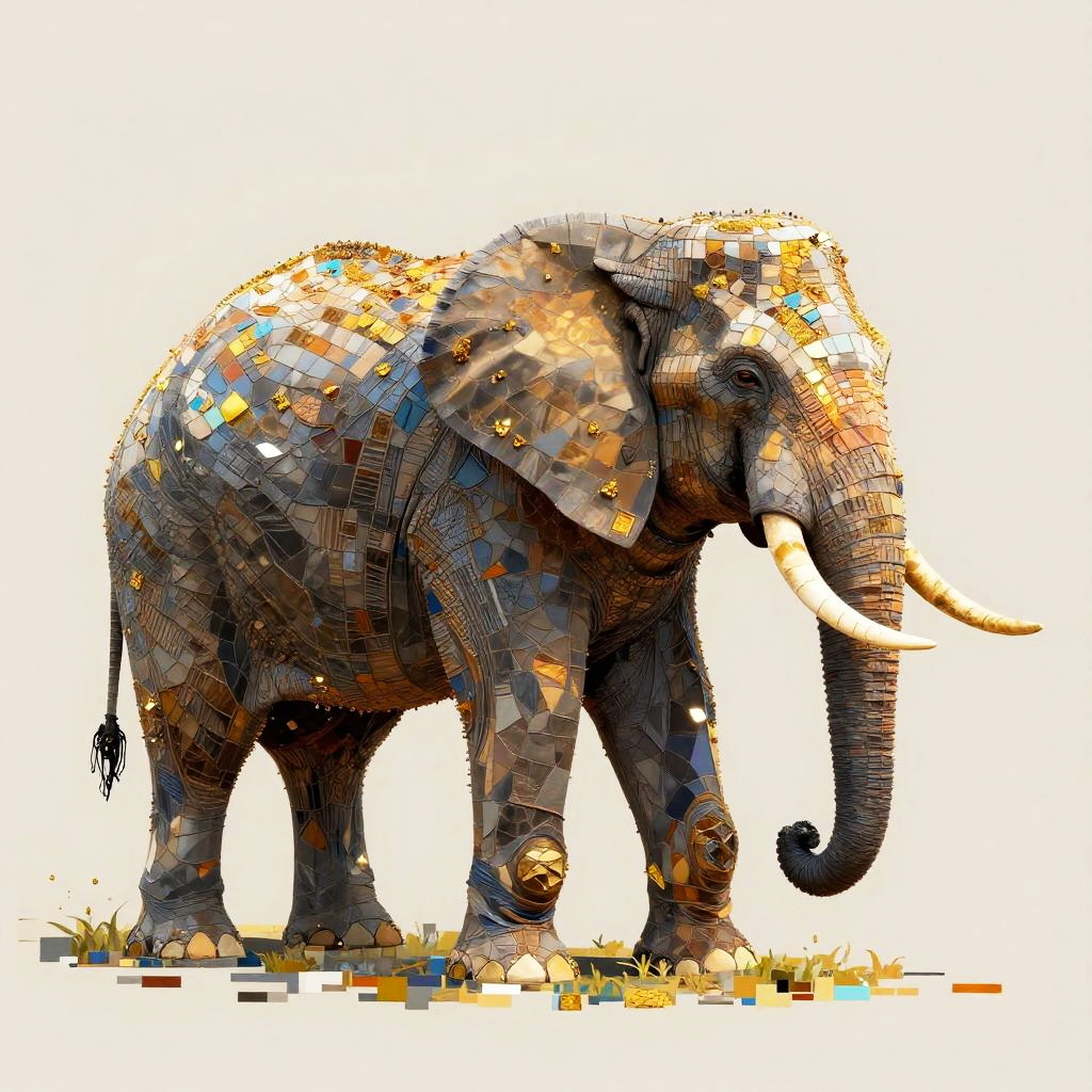 A detailed digital artwork featuring a graceful elephant composed of a mosaic of small, colorful mosaic tiles that form a fragmented, pixelated effect. The subject is portrayed in a regal style, with carefully arranged blocks creating depth and definition. The color palette is vibrant, including shades of deep gray, gold, bronze, cream that reflect light, giving the artwork a luminous quality.
