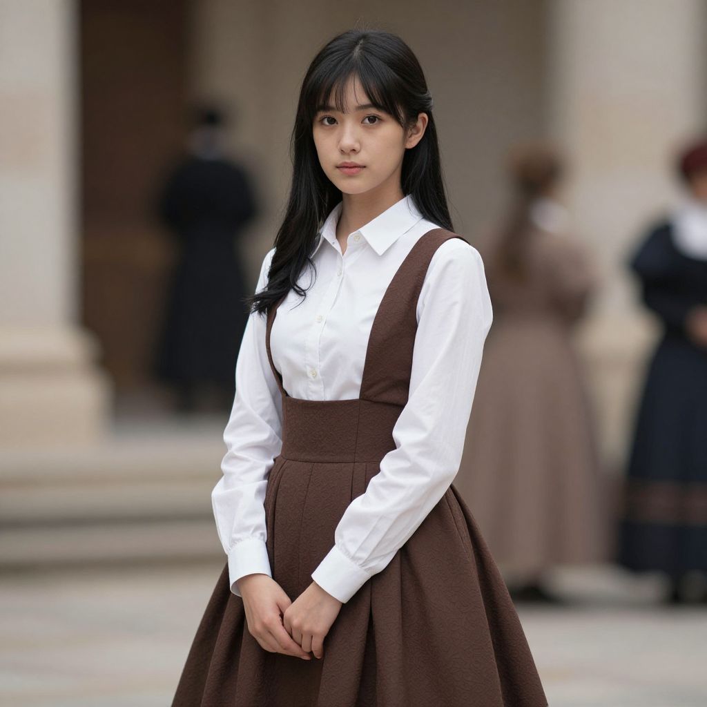 Photograph of an Asian woman with long black hair and bangs, standing outdoors in front of a blurred background of people and a building. She wears a white long-sleeve button-up shirt with a high collar and a dark brown pinafore dress with a high waist. Her hands are clasped in front of her. The background is slightly out of focus, showing indistinct figures in dark clothing, and a stone building with a doorway. The woman's expression is calm and neutral, and she stands slightly to the left of the center of the image.
