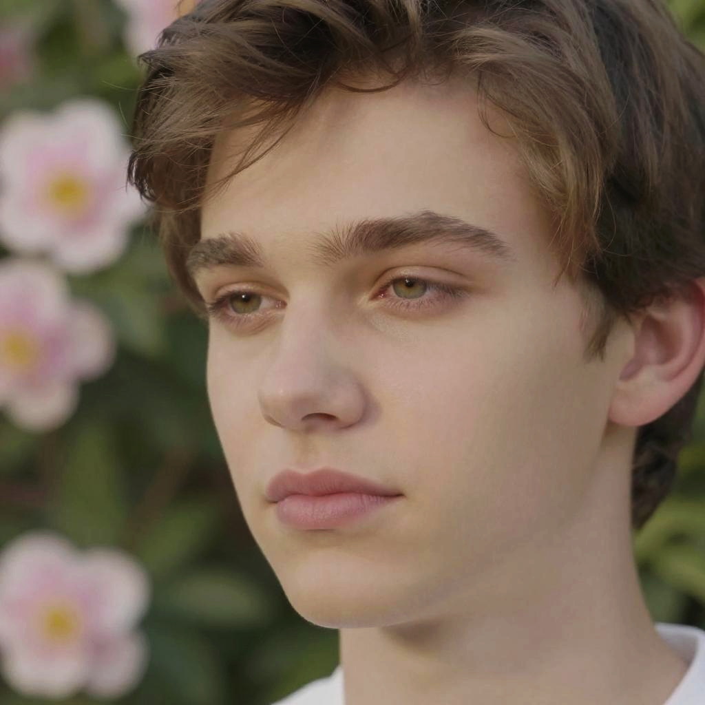 Close-up of Pom Klementieff young, natural sunlight, subtle makeup, serene expression, blurred floral background, soft focus, photorealistic high resolution