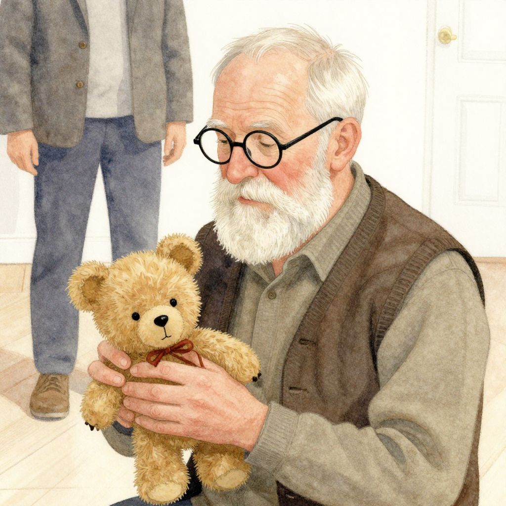 An elderly man with a white beard and glasses holds a teddy bear, while another person stands in the background, in a watercolor illustration for a children's book.
