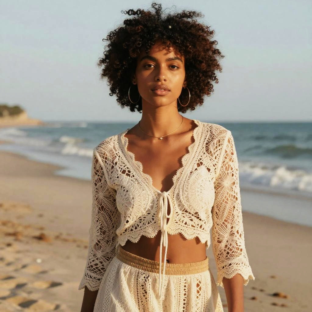 Drop Fade Afro hairstyle on female model, wearing bohemian lace top and skirt, in secluded beach, captured in fashion editorial style with soft golden hour sunlight.