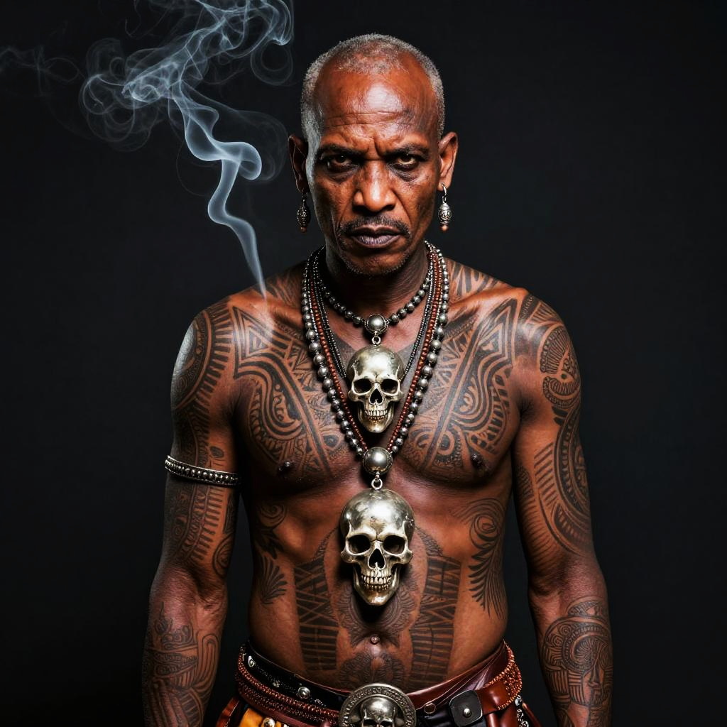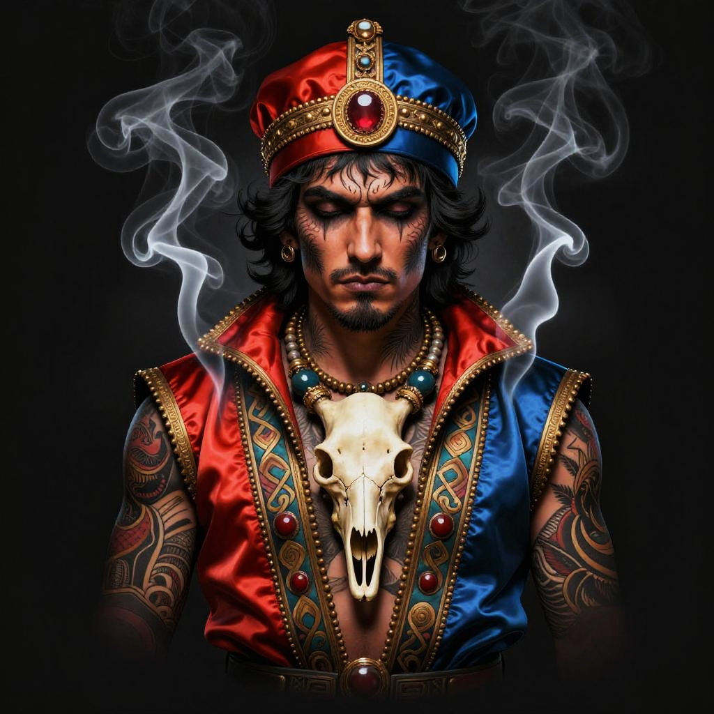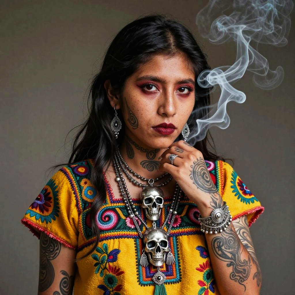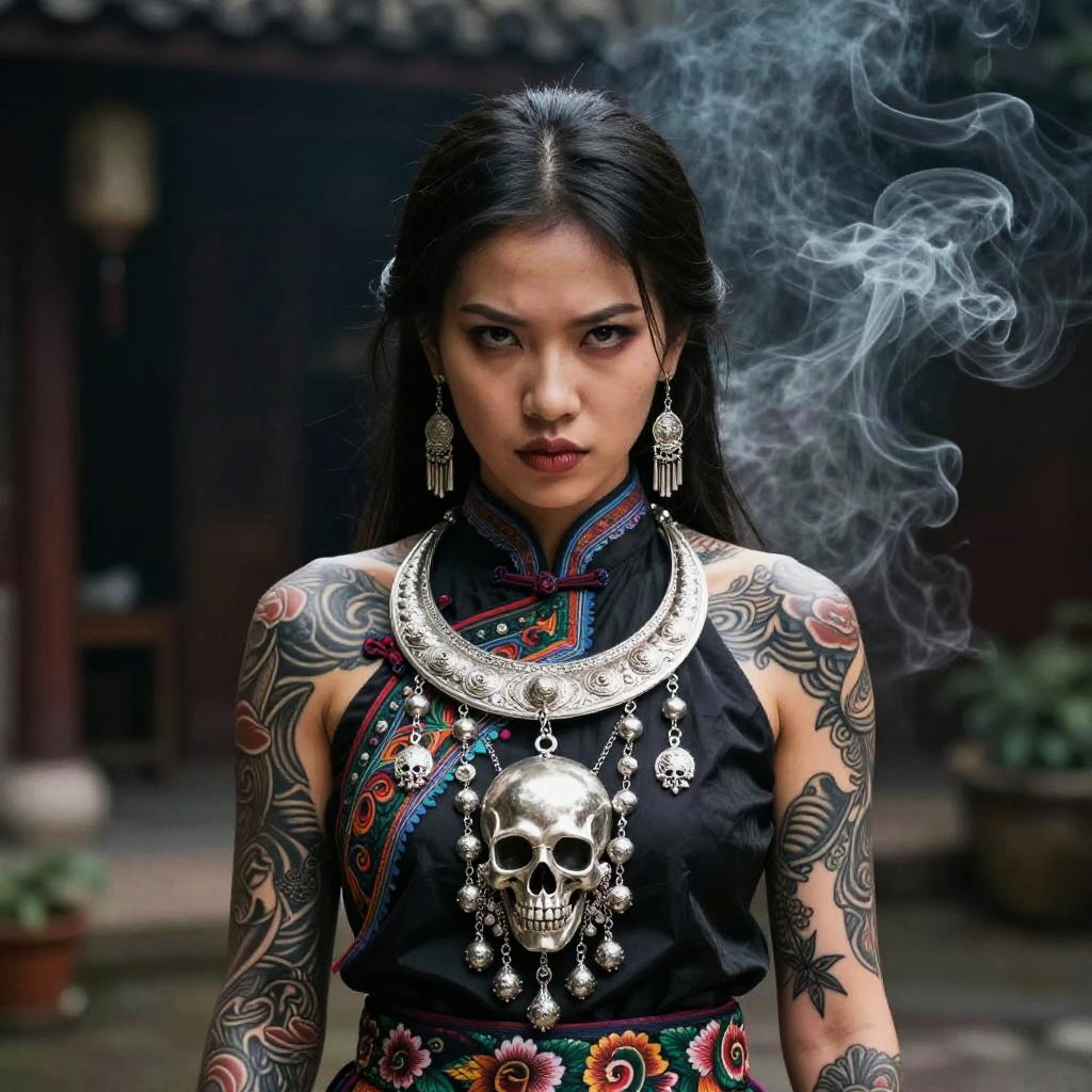 Neotraditional tattoo design of female of Vietnamese descent, wearing embroidered traditional clothes and silver skull jewelry, moody background, drifting smoke, fierce expression, intricate tattoo details