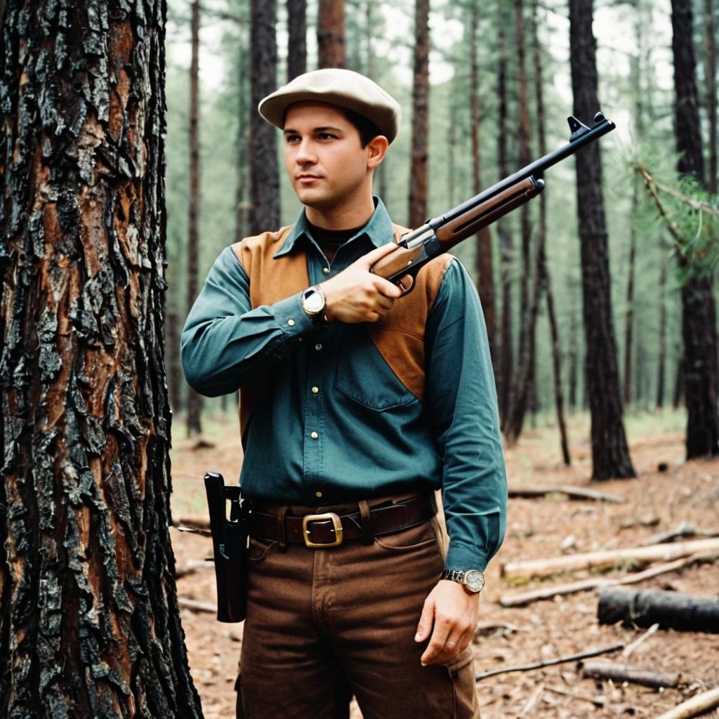 A young man dressed in brown pants, a green collared shirt with a brown vest, and a beige beret stands in a dense forest holding a shotgun. He wears a wristwatch on each wrist and has a holstered gun on his belt. The setting is a natural woodland area with tall pine trees and a scattered leaf-covered ground.