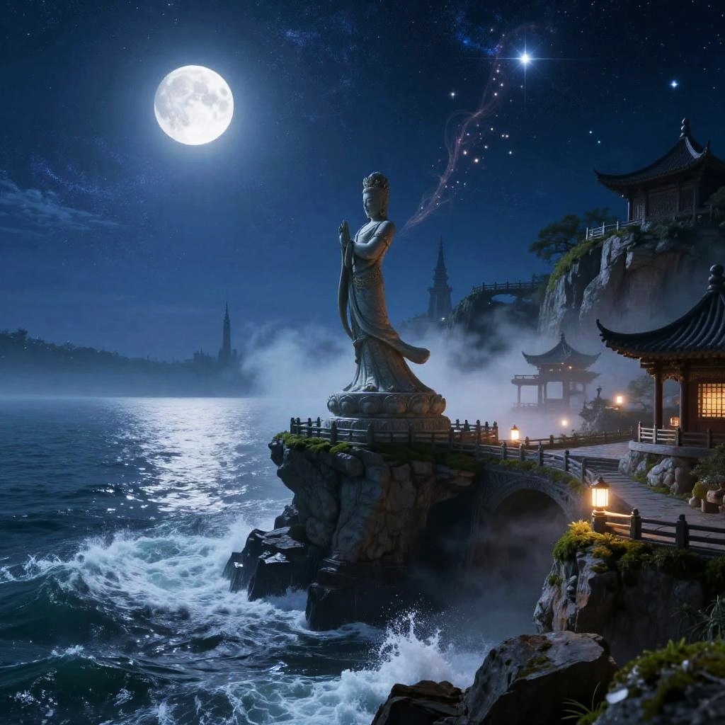 A monumental stone dancer poised on a moonlit cliff edge set within rocky coastal promontory with crashing cold waves, wrapped in ethereal mist and drifting incense, glowing stars scattered above, a celestial vault painted with deep sapphire night with bright moonlight and twinkling stars. Tranquil waters mirror the heavens, distant spires and bridges on rocky arches, lantern-lit sanctuaries and mossy terraces, a serene dreamlike atmosphere with surreal, intricate details; cinematic composition, volumetric fog and light rays, hyper-detailed textures, high dynamic range, wide-angle vista, depth of field, soft rim light, subtle film grain, epic scale.
