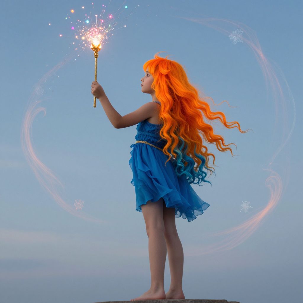 Child stands barefoot, her vibrant hair cascading in fiery orange hues to cool blue waves, as she holds a whimsical wand that scatters colorful sparks and swirling patterns across the ethereal sky.