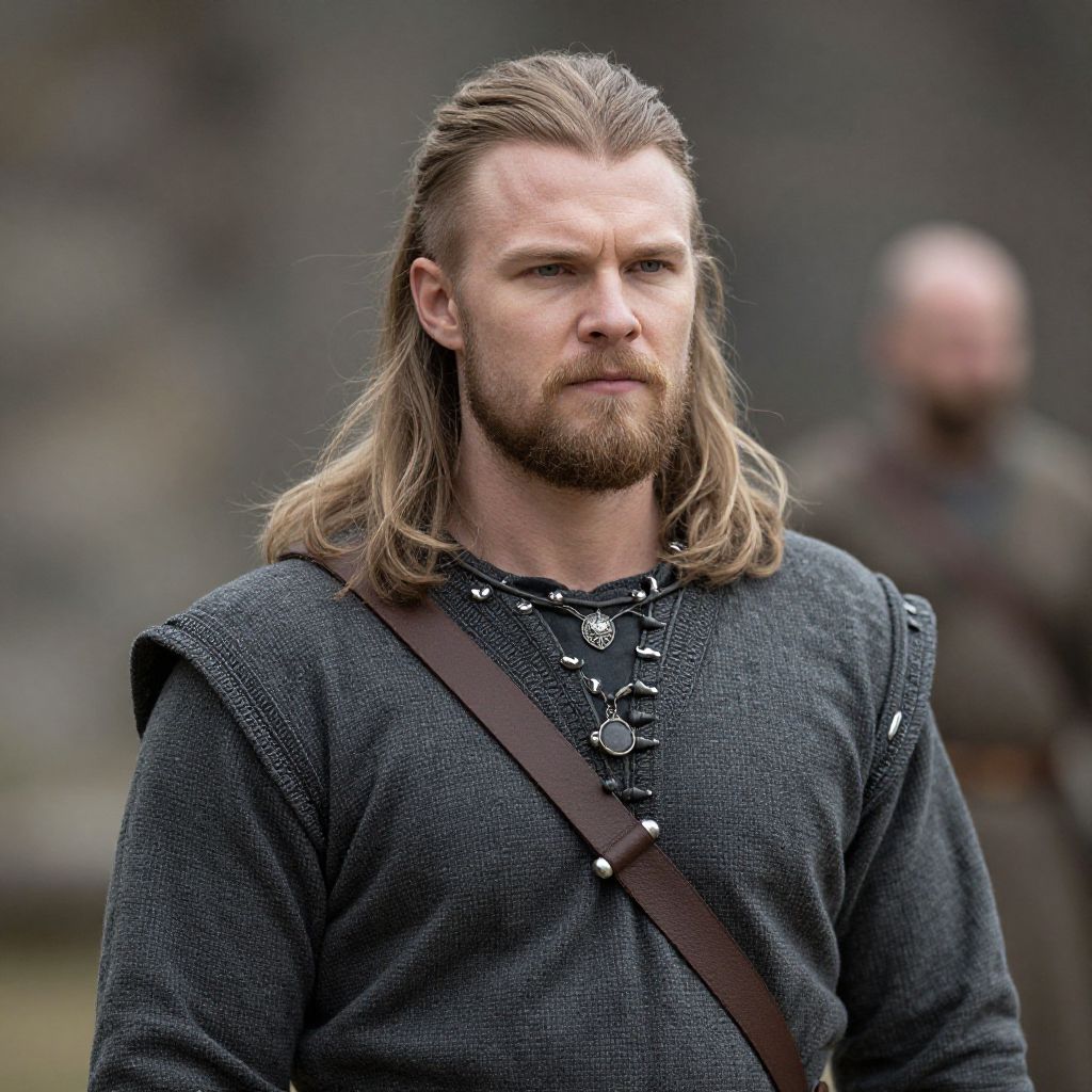 Photograph of a Caucasian man with long, blonde, slightly wavy hair and a full beard. He has a serious expression and is wearing a dark gray, textured, medieval-style tunic with a brown leather strap crossing his chest. The background is blurred but suggests an outdoor, wooded area with muted, earthy tones. Another indistinct figure is visible in the background, slightly out of focus. The man's hair is parted in the middle and his eyebrows are slightly raised. The overall style is realistic and cinematic, suggesting a historical or fantasy setting.