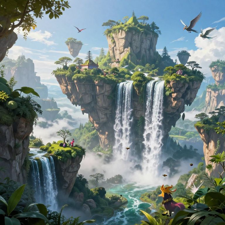 32k resolution fantasy landscape with floating islands and waterfalls, lush greenery, mystical creatures flying around, ultra-high detail with vivid colors and dynamic lighting