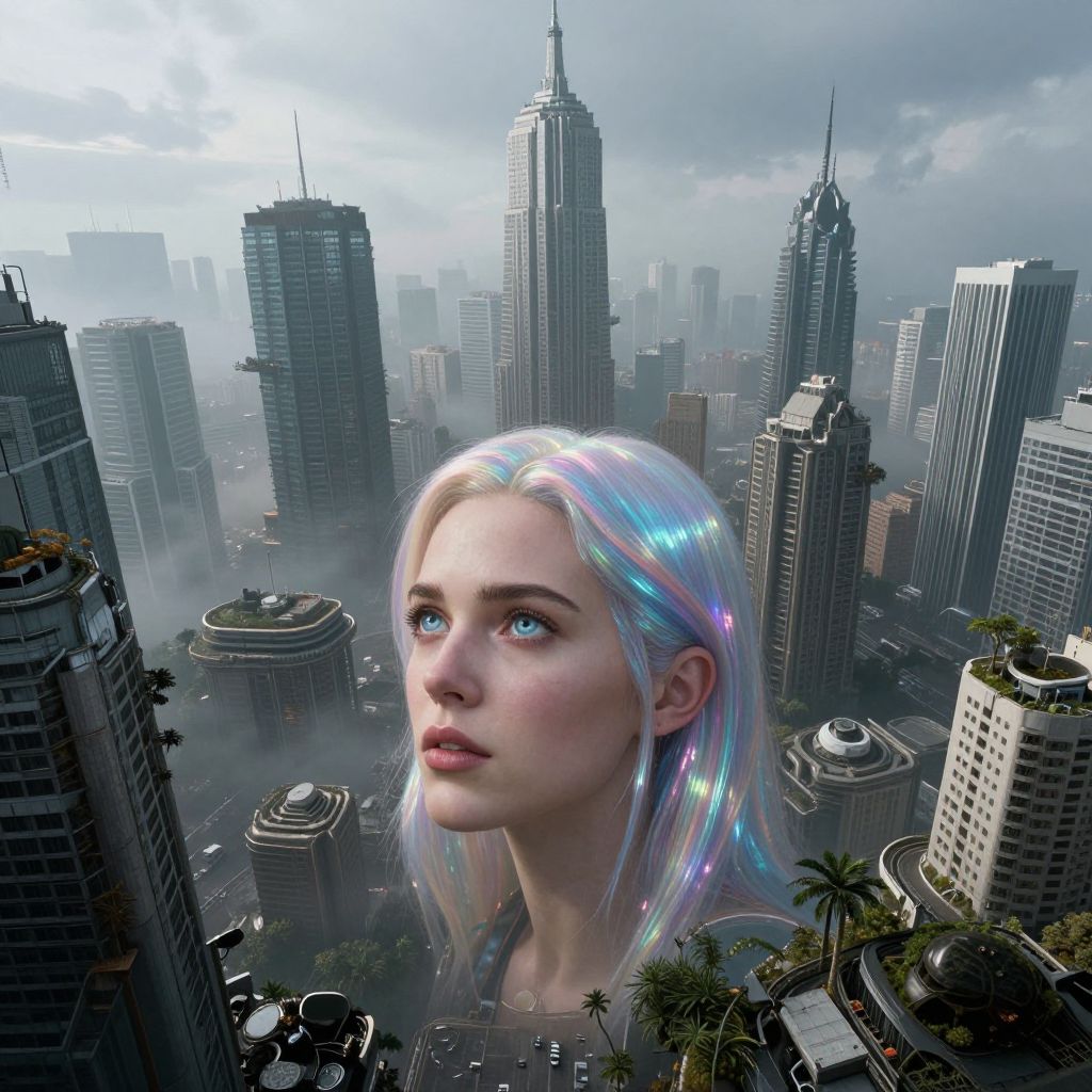 A digitally rendered CGI image featuring a giant, fair-skinned woman with iridescent, rainbow-colored hair gazing upwards in a densely packed, futuristic cityscape. Her large, blue eyes and delicate features contrast with the towering, steel-and-glass skyscrapers around her. The background includes misty, overcast skies and a mix of modern and classic architecture. Palm trees are visible at the bottom of the frame, adding a touch of greenery to the urban environment. The woman's expression is calm and introspective, enhancing the surreal, almost fantastical atmosphere of the scene.