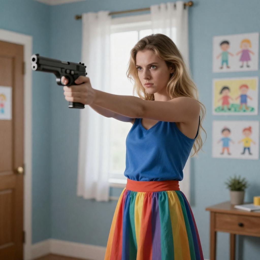Photograph of a young woman with short, light brown hair and fair skin, wearing a light blue shirt, pointing a black handgun forward. She has a focused, intense expression. She wears small, gold hoop earrings. Background features closed blinds.