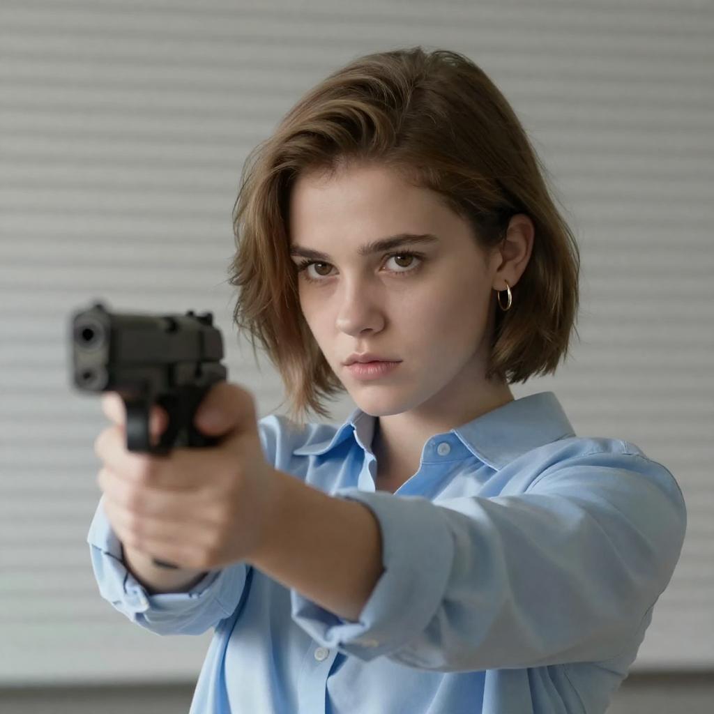 Portrait of a young woman with short light brown hair and fair skin wearing a light blue shirt. She is pointing a black handgun forward with a focused and intense expression. She wears small gold hoop earrings. The background features closed window blinds.