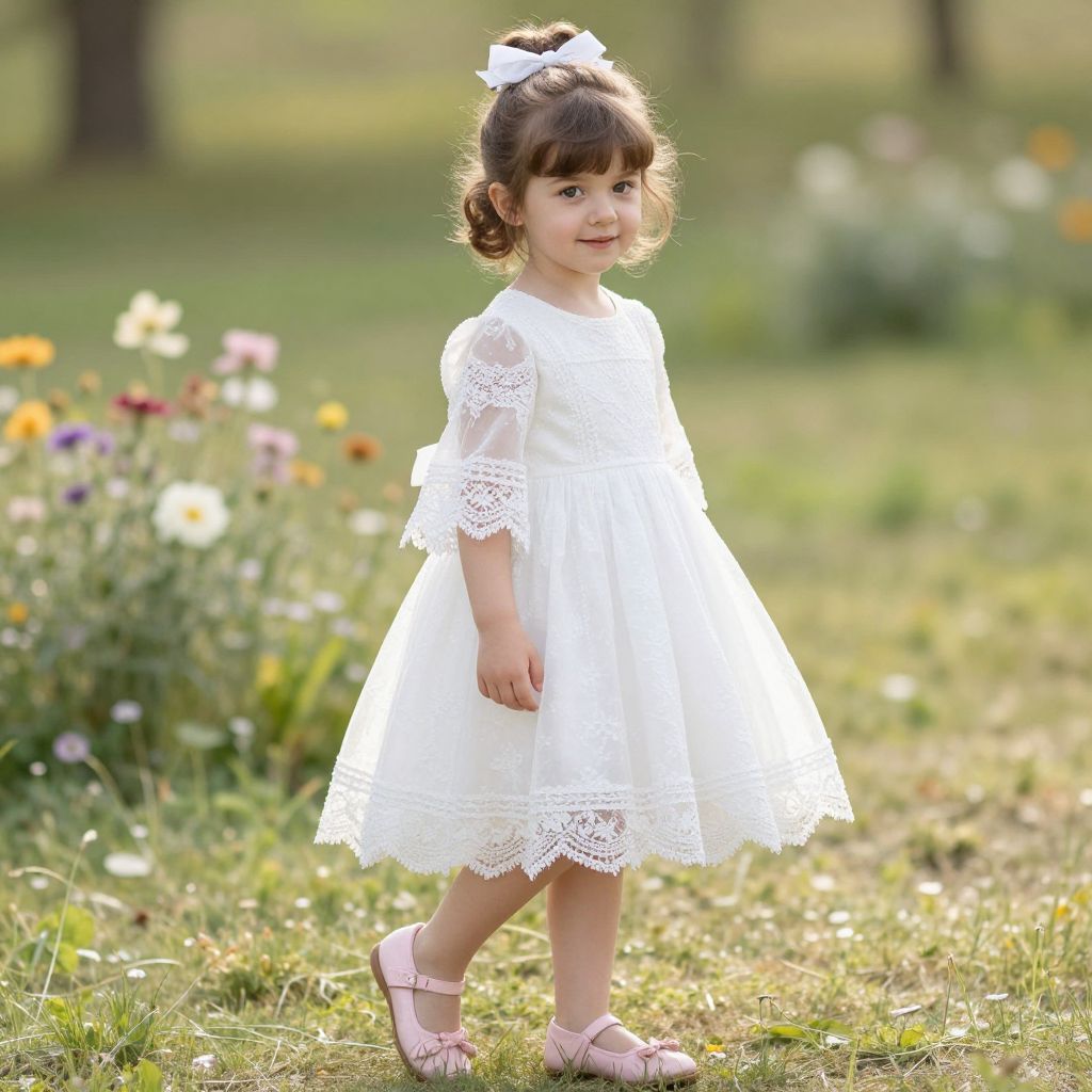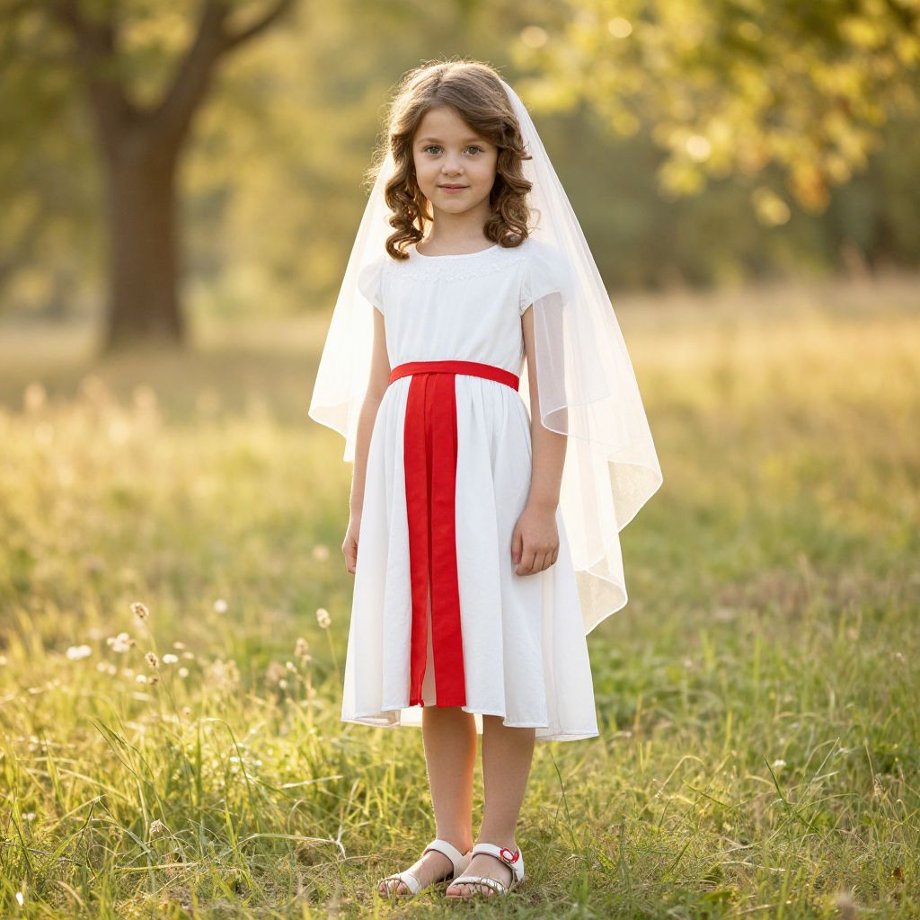A young girl with soft, curly brown hair and warm, expressive eyes stands in a sunny meadow, dressed in a flowing white dress with a bold red stripe down the center. She wears a delicate, flowing veil that drapes over her shoulders and falls gently behind her, adding a touch of elegance. Her feet are bare, resting in simple white sandals with red accents. The scene is bright and peaceful, with soft golden sunlight filtering through the trees, creating a dreamy, nostalgic atmosphere.