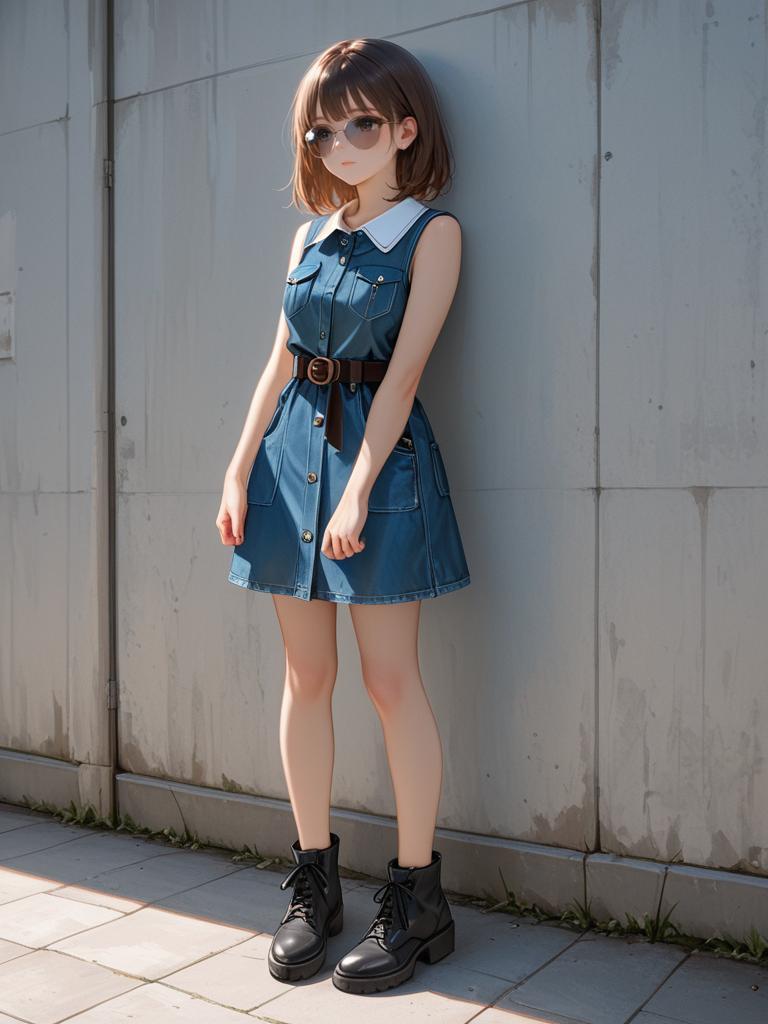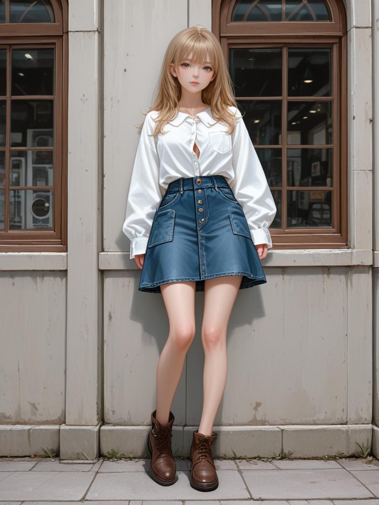Photograph of a young blonde woman with long hair, wearing a white blouse, high-waisted blue denim skirt, and brown ankle boots, standing