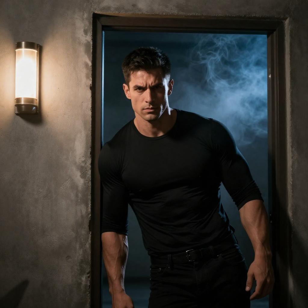 Portrait of a muscular man with short dark hair, wearing a plain white t-shirt. He stands against a dimly lit brown background with warm lighting highlighting his strong features and casting soft shadows. The man looks directly at the camera with a serious expression, conveying confidence and determination.