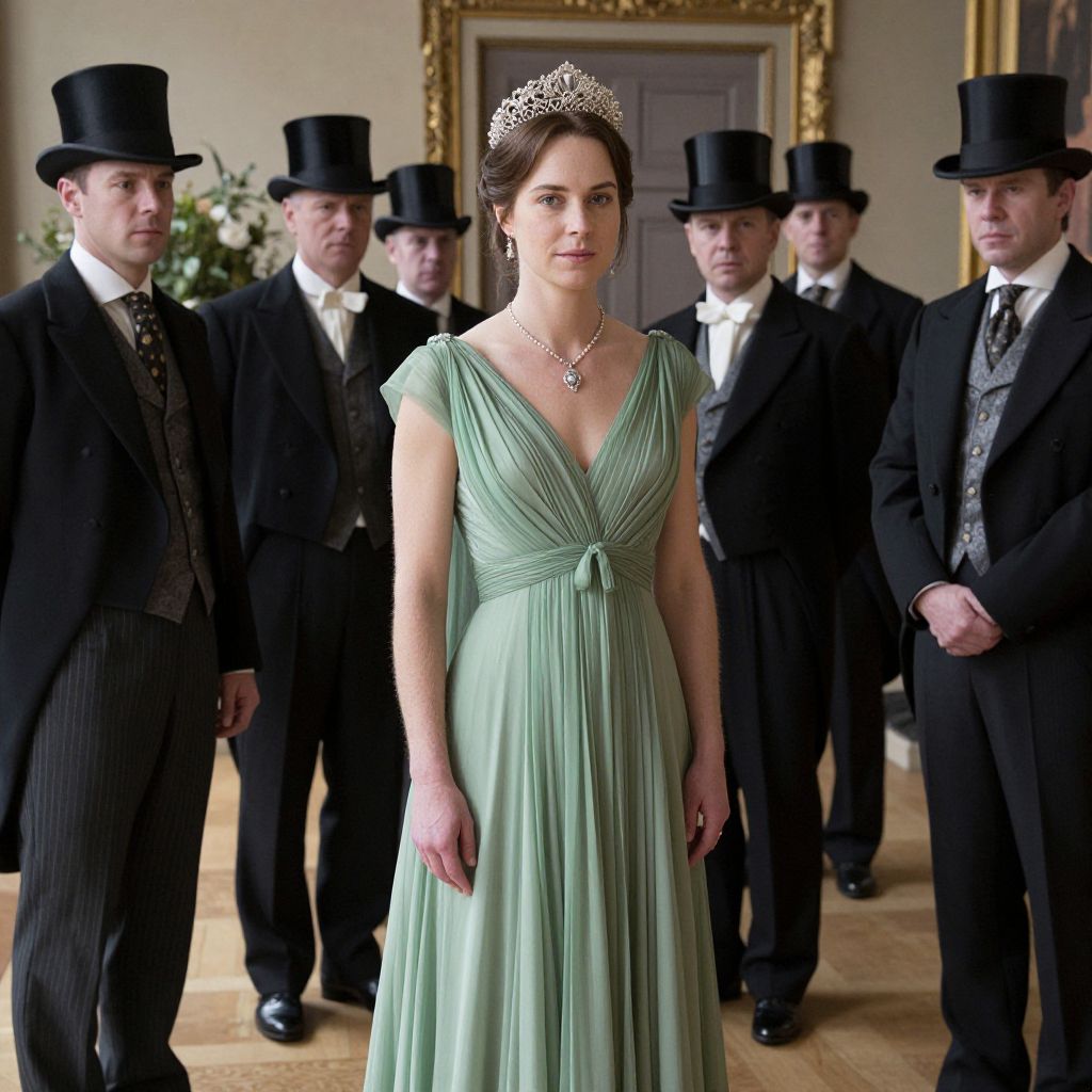 Elegantly dressed woman wearing a green gown and tiara stands prominently in the foreground, surrounded by formally attired gentlemen in top hats and suits at a grand indoor gathering reminiscent of *Downton Abbey*.