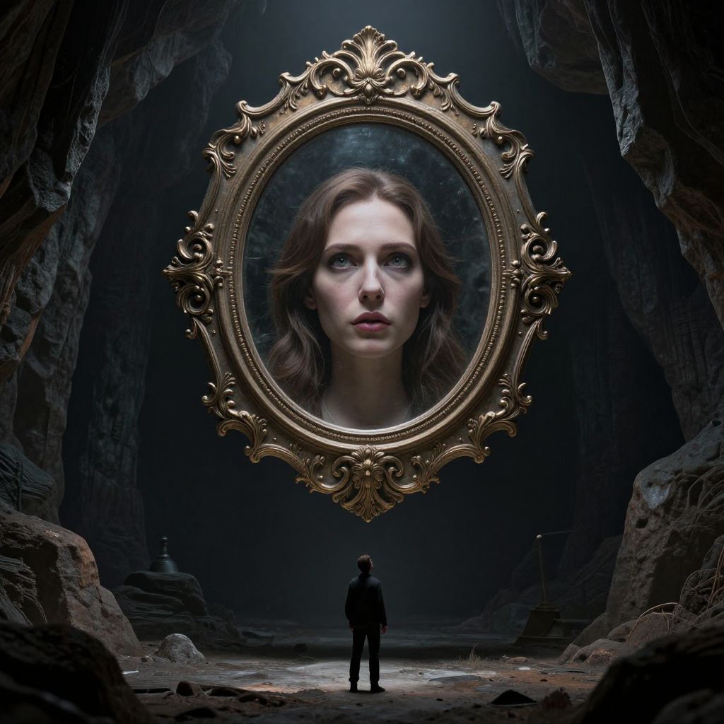 Digital artwork of a man standing before an ornate, gold-framed circular mirror in a dark, rocky cave, reflecting a woman's intense gaze.