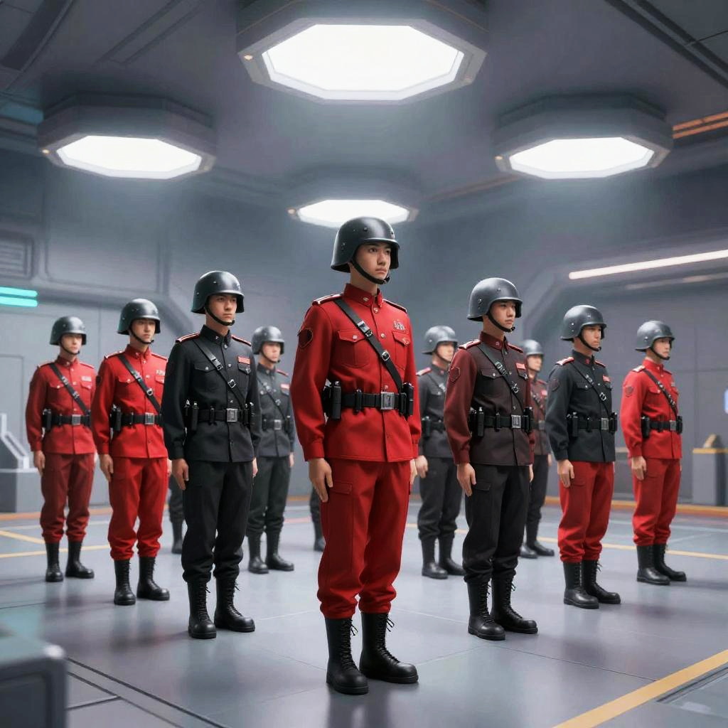 A group of soldiers clad in red and black military uniforms, standing in formation on a futuristic parade ground, bright overhead lights casting shadows, sleek helmets and synchronized posture, minimalistic yet highly detailed scene.