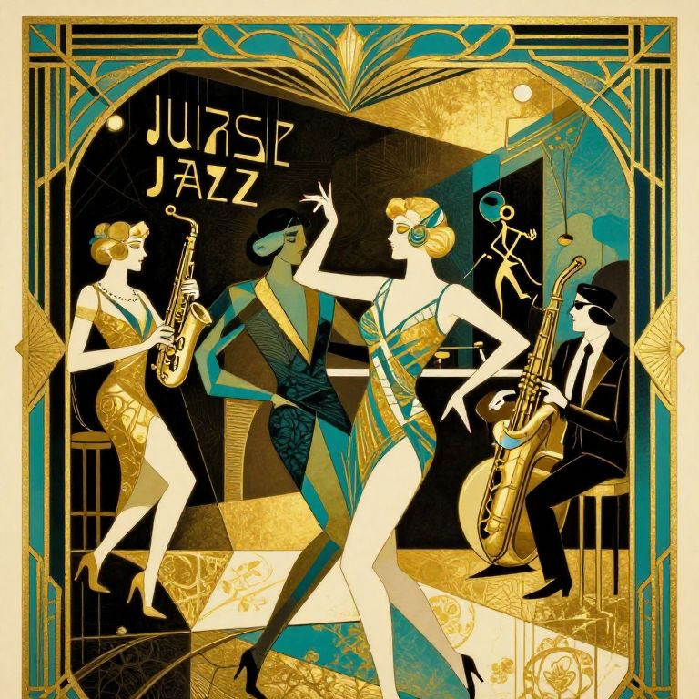 Art deco jazz poster illustrating a crowded jazz club scene with stylized dancers and musicians in streamlined, geometric forms, luxurious gold and turquoise colors with bold, contrasting shadows, intricate border designs reminiscent of 1920s posters, lively and rhythmic atmosphere.