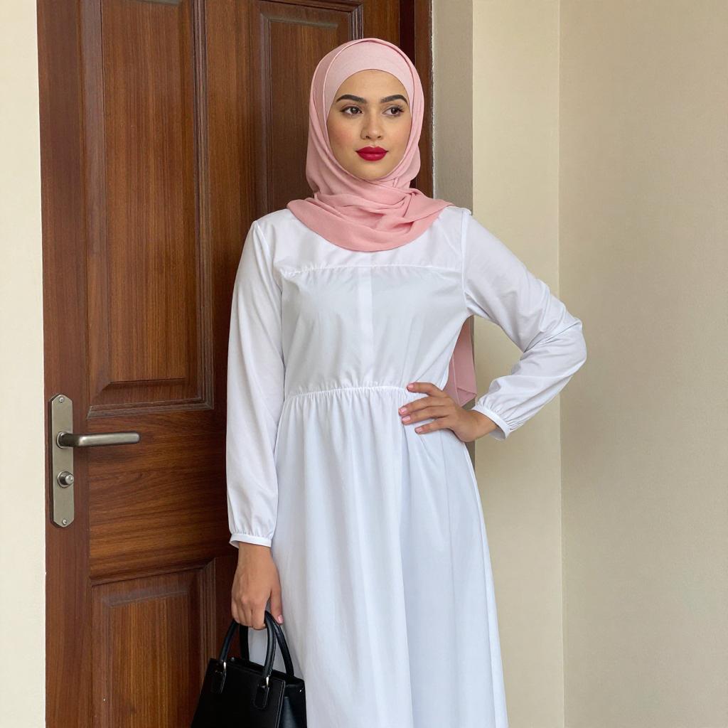 Photograph of a young woman with light skin and red lipstick, wearing a white long-sleeve dress and a pink hijab. She stands against a beige wall and wooden door, with one hand on her hip and a black handbag at her side. She has a confident expression and is slightly leaning to the left.