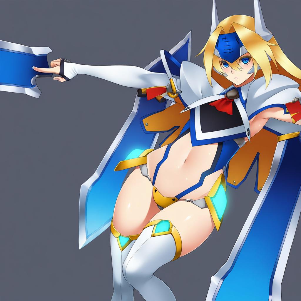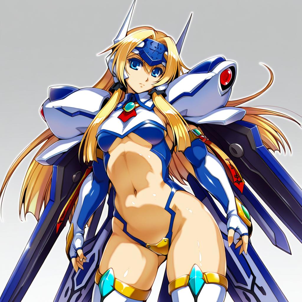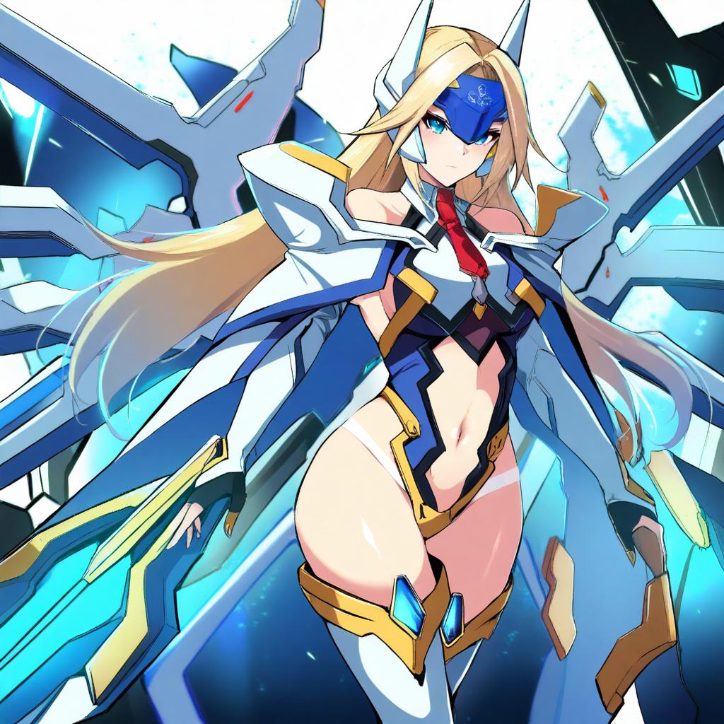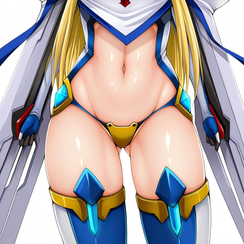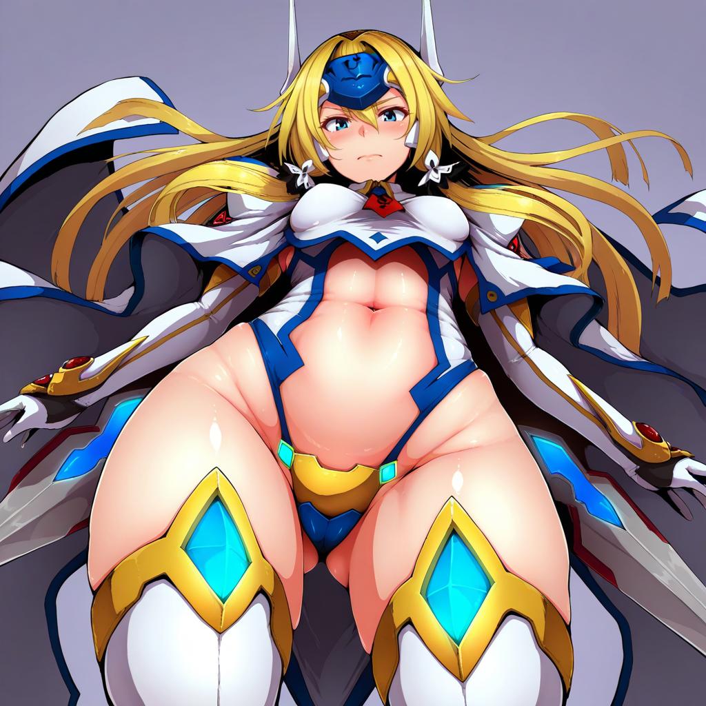 Mu-12, blazblue, 1girl, blue eyes, long hair, blonde hair, navel, thighhighs, mecha musume, crotch plate, forehead protector, by artist nonoririn, illustrious