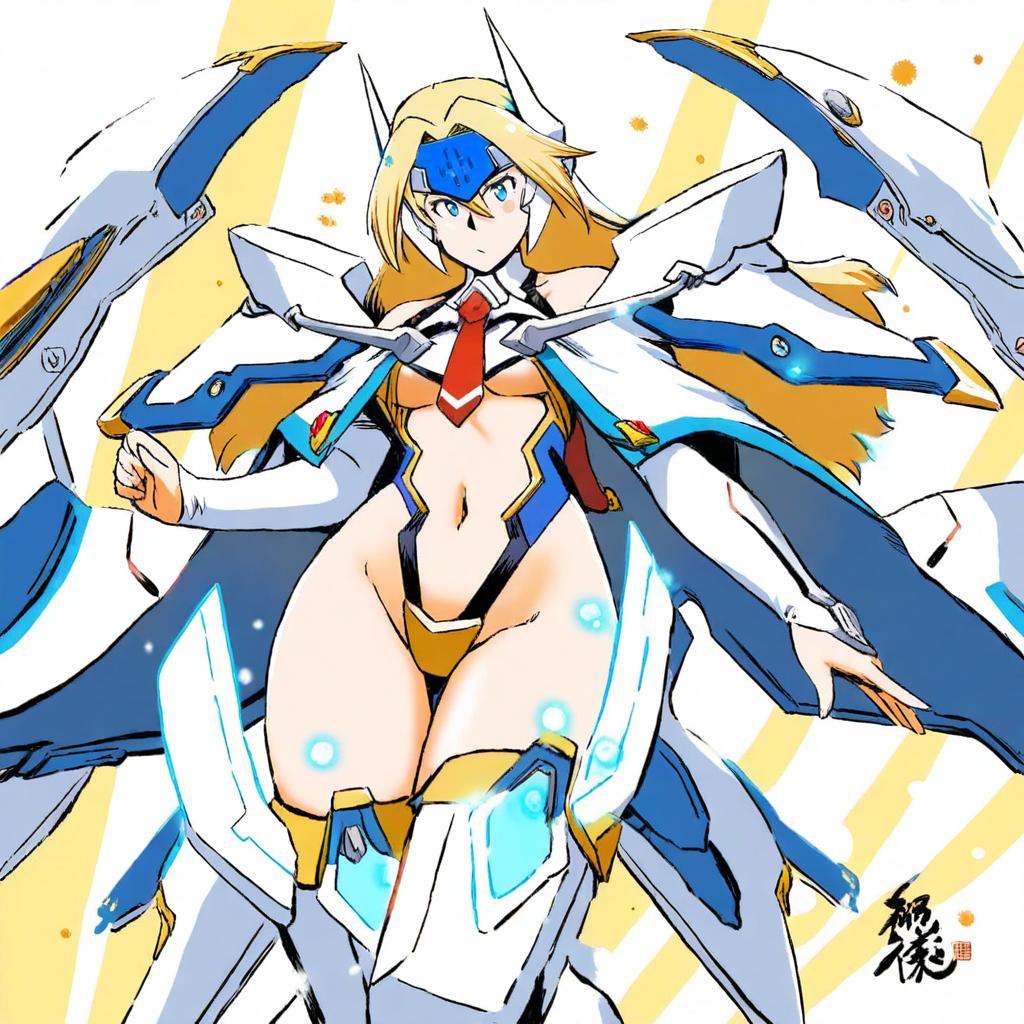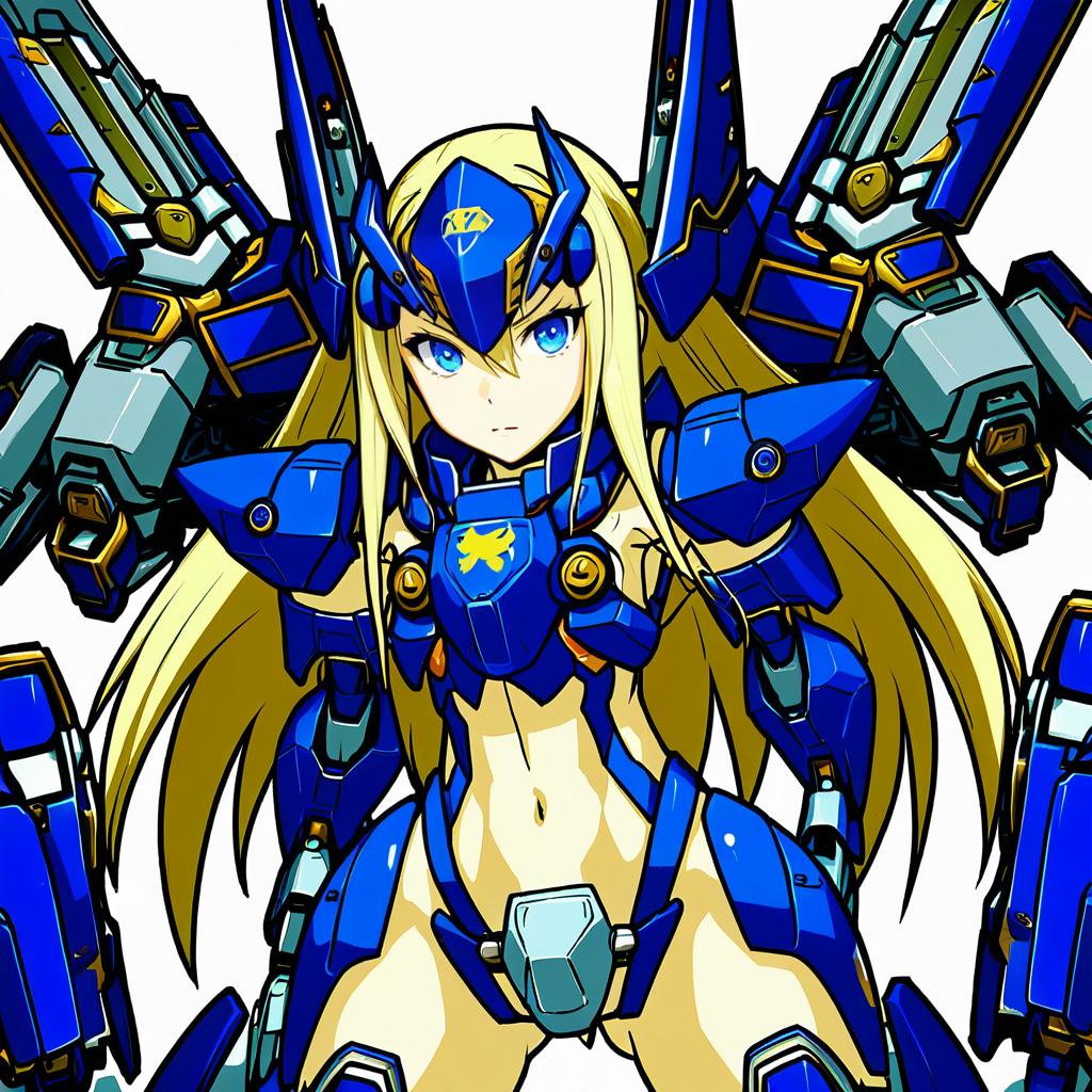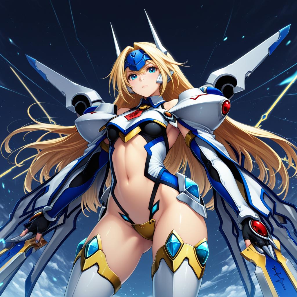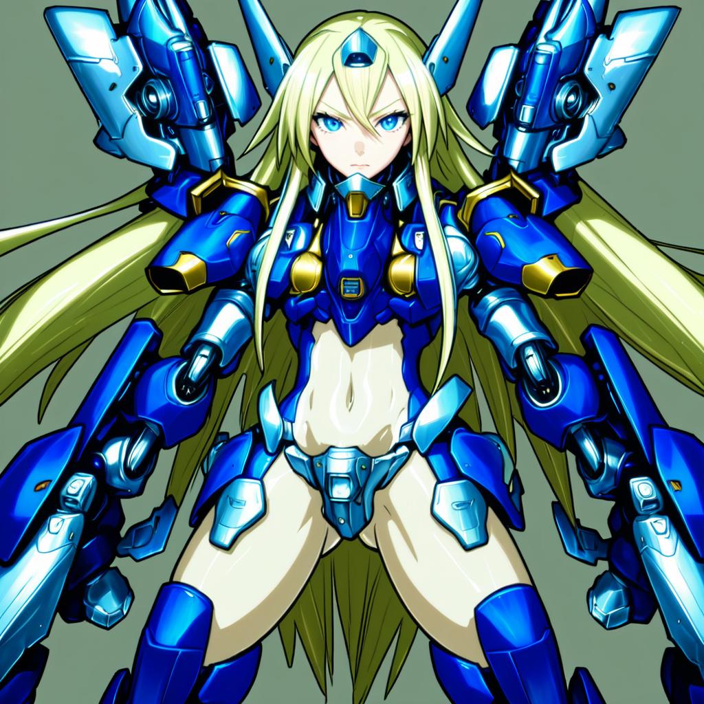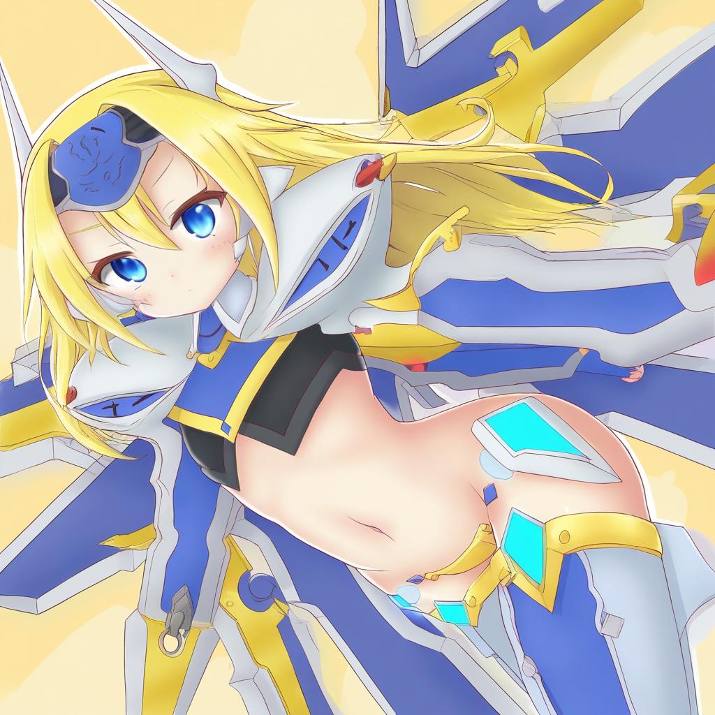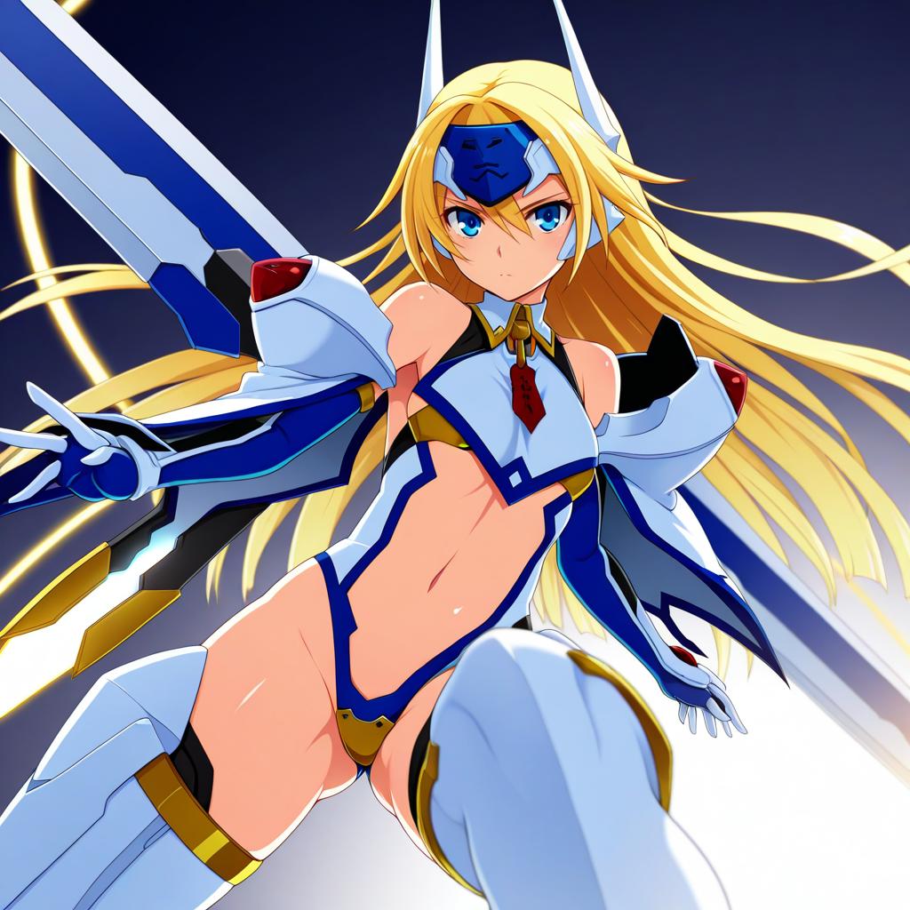Mu-12, blazblue, 1girl, blue eyes, long hair, blonde hair, navel, thighhighs, mecha musume, crotch plate, forehead protector, by artist nonoririn, illustrious