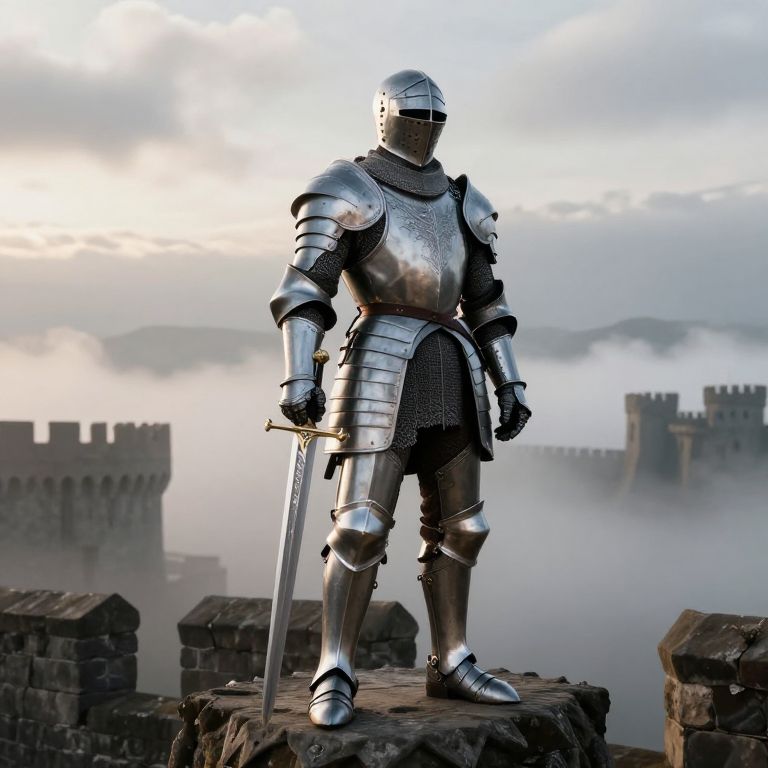Kight standing atop a misty medieval castle wall at dawn, clad in shining silver armor with intricate engravings, a broad sword in hand, and a determined gaze under a cloudy sky, cinematic lighting, detailed fantasy art style