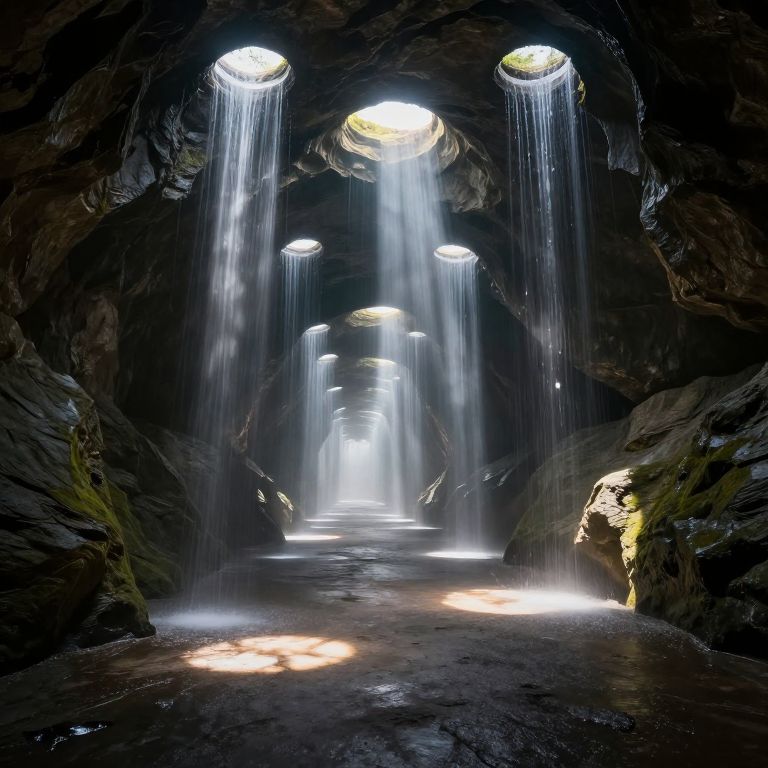 A mesmerizing tunnel carved through a hollow mountain stretches infinitely forward, its walls lined with cascading light beams piercing through circular openings above, creating an ethereal pathway illuminated by alternating patches of sunlight and shadow.